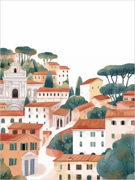 The picture shows a serene aldea nestled in the mountains, with red-roofed houses scattered among the green trees. At the centro is an viejo iglesia. Luz solar bathes the rooftops and treetops, evoking a sentido of paz and tranquilidad, as if tiempo has stood still here.