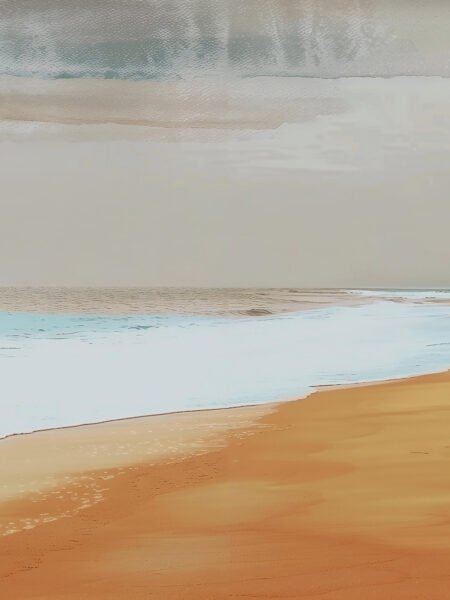 This pintura representa a tranquil shoreline, where dorado sands meet gentle waves, and the cielo displays suave hues of gris and blue. The overall escena conveys a sentido of calm and relaxation, silently narrating the serene beauty of naturaleza. De pie before the pintura, one can almost sienten the mar