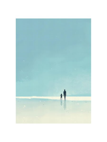 This pintura representa an adulto and a niño caminando along the playa, with a vast cielo and a serene mar in the fondo. The suave tones and minimalist style evoke a sentido of calm and calidez, as if the mundo is reduced to this intimate pair, compartiendo a quiet momento