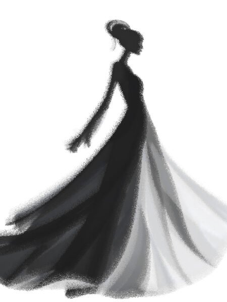 This pintura representa a mujer in a black and white gown, gracefully bailando. The combination of simple black-and-white tones and suave brushstrokes crea a dreamy and romantic atmosphere, as if she is bailando through tiempo, embodying elegance and mystery.
