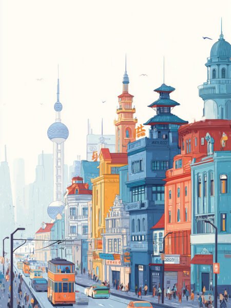La escena muestra una calle de Shanghái donde tranvías y peatones conviven entre edificios históricos y rascacielos modernos. El ambiente transmite el equilibrio único entre tradición, modernidad y el ritmo elegante de la ciudad.