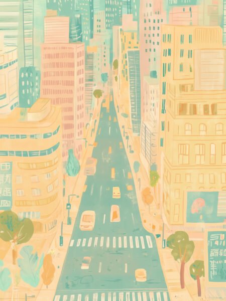 La luz suave de la mañana despierta la calle. Los edificios reposan bajo un cielo claro, mientras los coches avanzan despacio y algunos peatones aparecen. La ciudad aún guarda silencio, pero empieza a moverse, mostrando el instante tranquilo en que la vida urbana comienza.