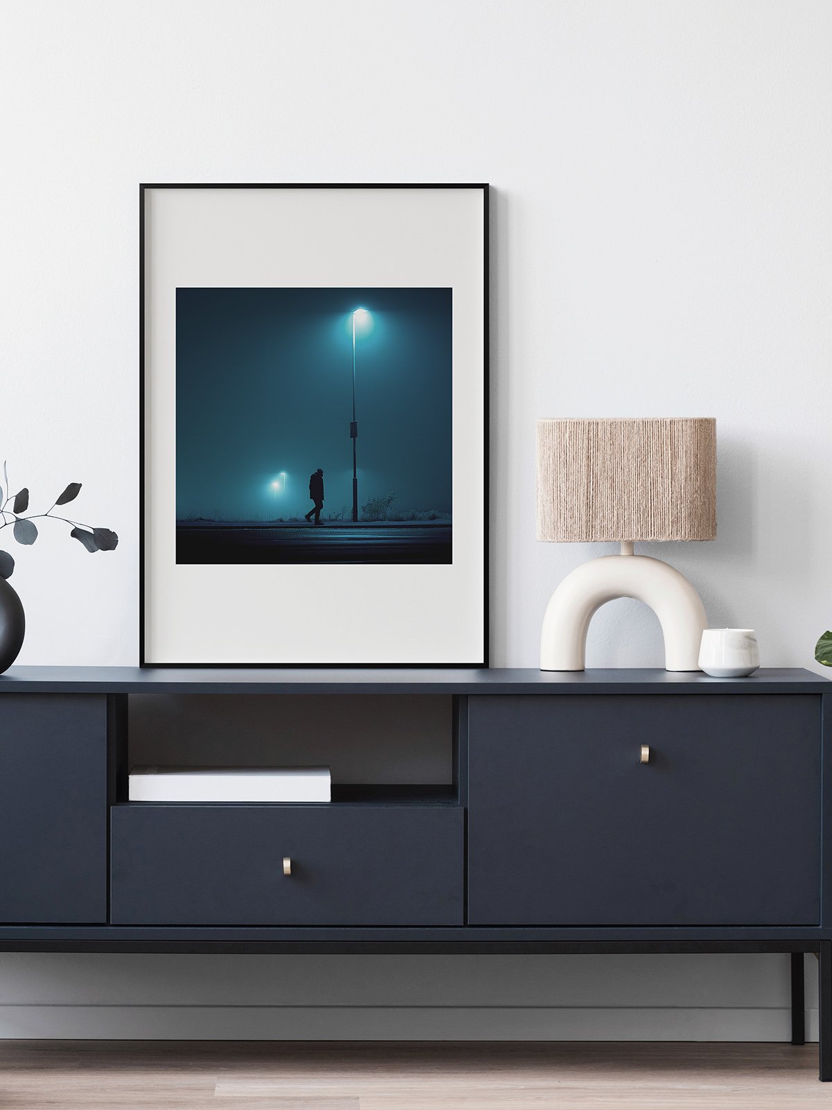 This image representa a solitary walker strolling on a foggy noche, with streetlights emitting a fresco blue glow. The entire escena is filled with a sentido of loneliness and mystery, evoking a sintiendo of nighttime tranquilidad and a hint of melancholy.