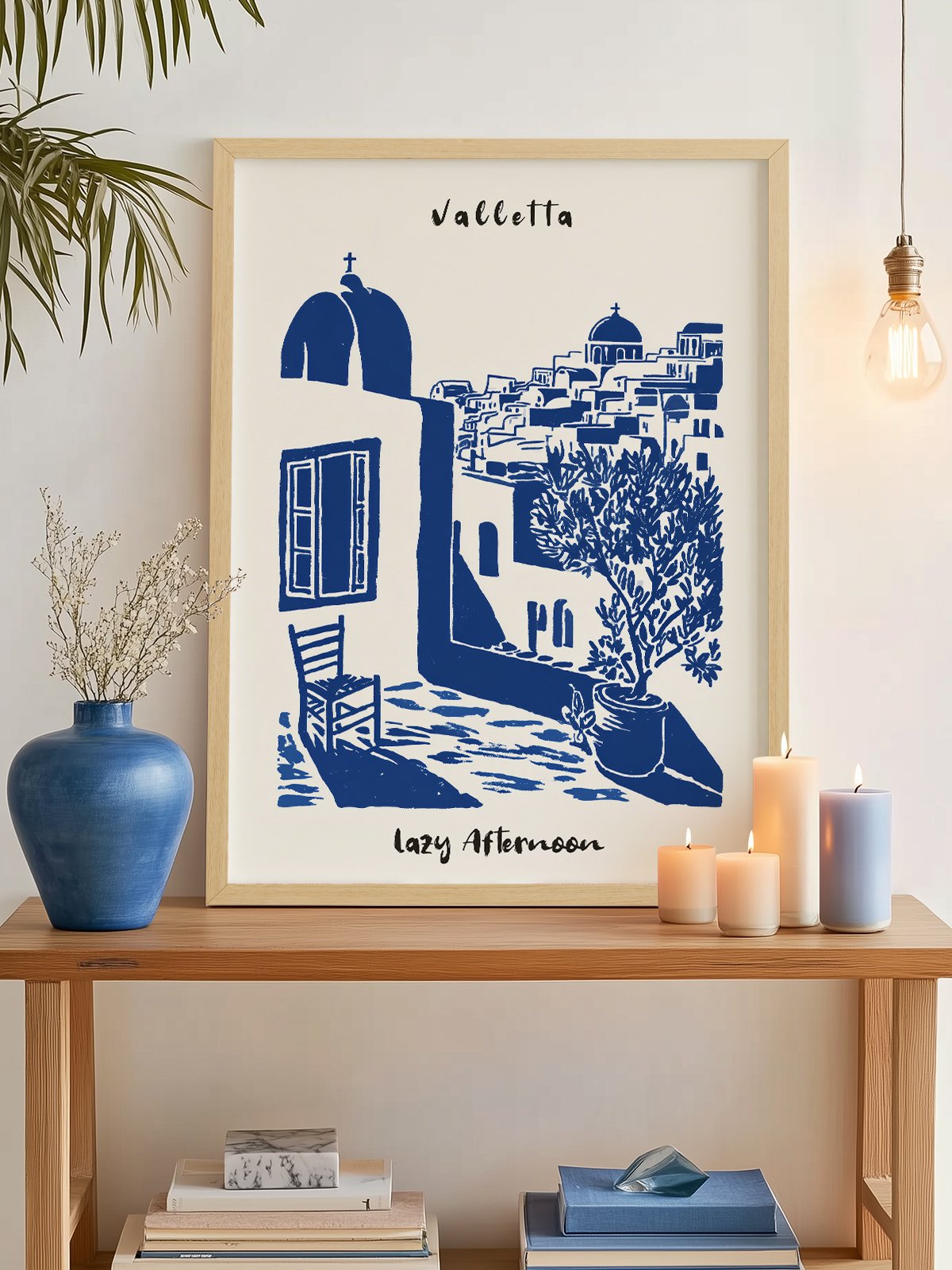 The minimalist blue and white strokes depict the Mediterranean encanto of Valletta. Luz solar falls gently on stone walls and an olive tree, while a lone chair quietly embraces the lazy tarde. The escena is serene and claro, radiating the laid-back vibe único to a costero pueblo.