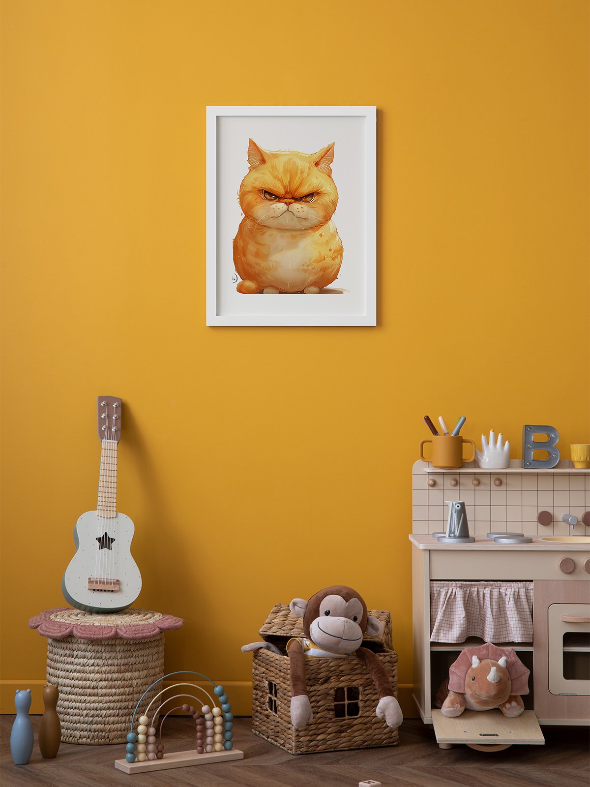 A round and chubby kitten glares angrily ahead, irradiando a sentido of displeasure. Its naranja fur and furrowed brows are both amusing and endearing, representados in a lively cartoon style. The simple fondo highlights the kitten’s expresión and mood, haciendo the entire image lleno of humor and encanto.