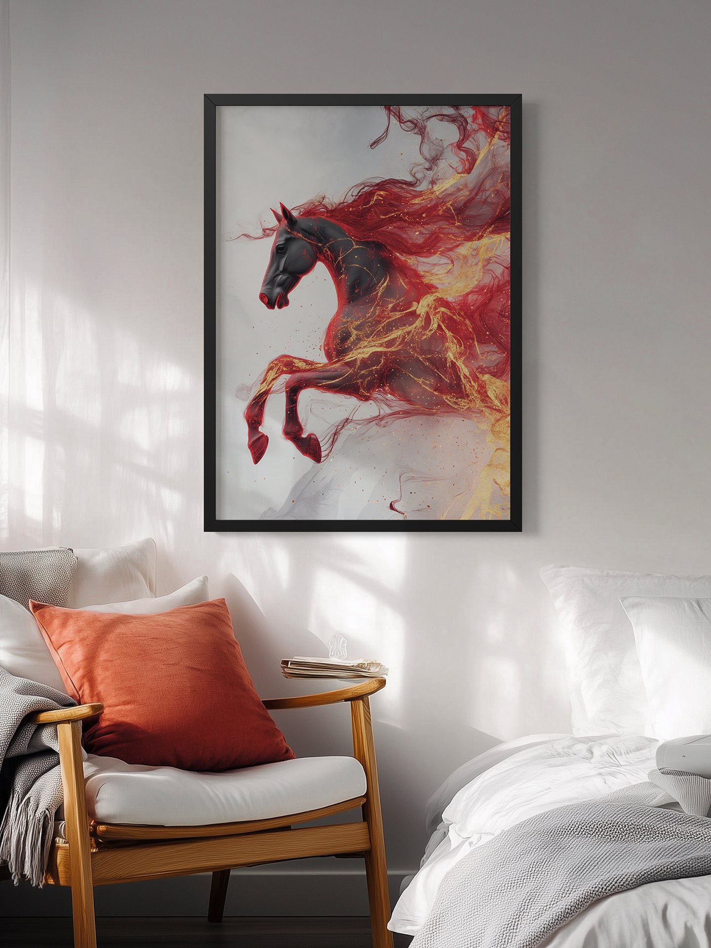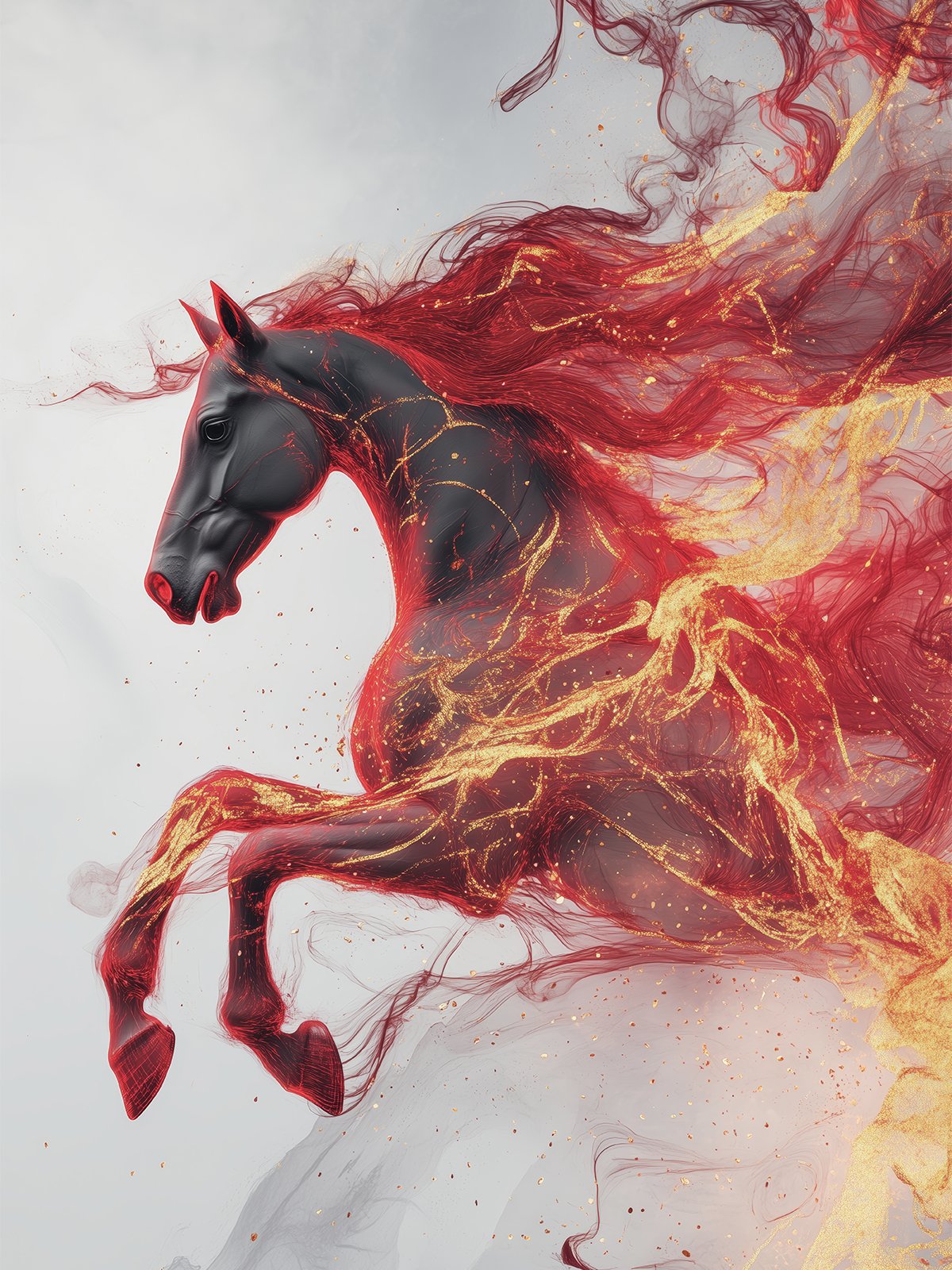 ‌ En esta pintura decorativa, un caballo negro está adornado con llamas y brillo dorado, su crin y cola volando como fuego, galopando vívidamente contra un fondo gris-blanco, esparciendo chispas doradas. Está llena de dinamismo y fantasía, como si encendiera la pasión y los sueños internos del espectador.