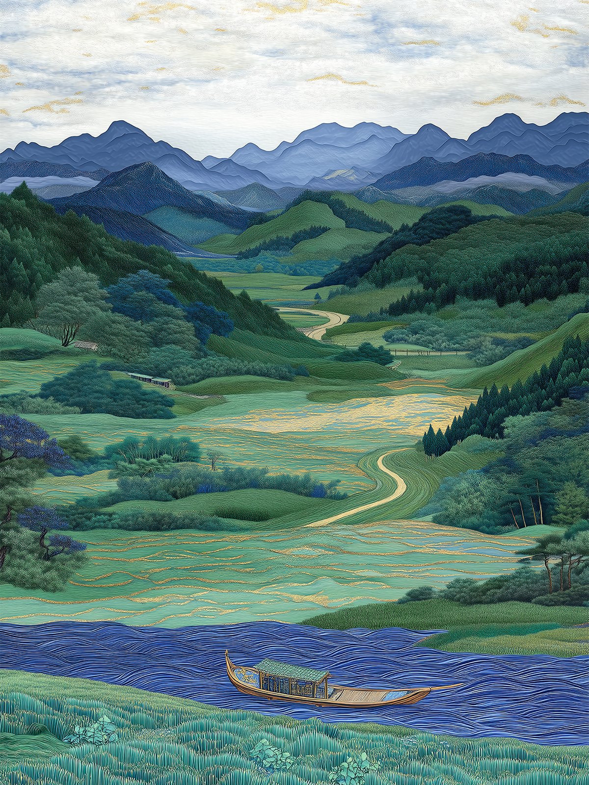 Montañas superpuestas rodean amplios campos verdes, mientras un camino serpenteante se pierde en la lejanía. El río fluye en calma y una pequeña barca descansa sobre el agua. La escena transmite amplitud, serenidad y una sensación de pausa, como si la naturaleza ofreciera descanso y equilibrio interior.