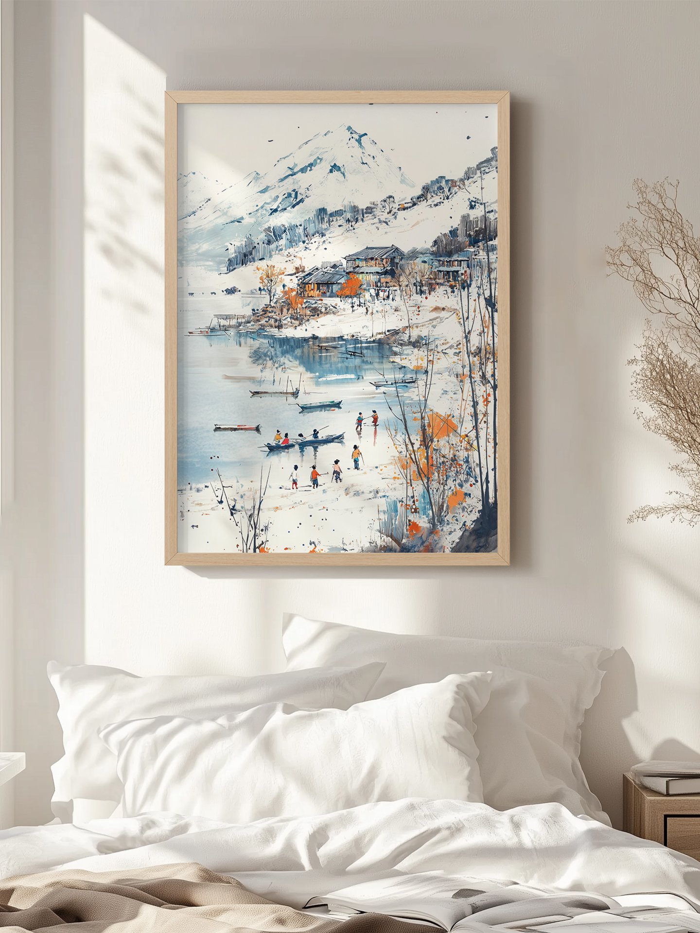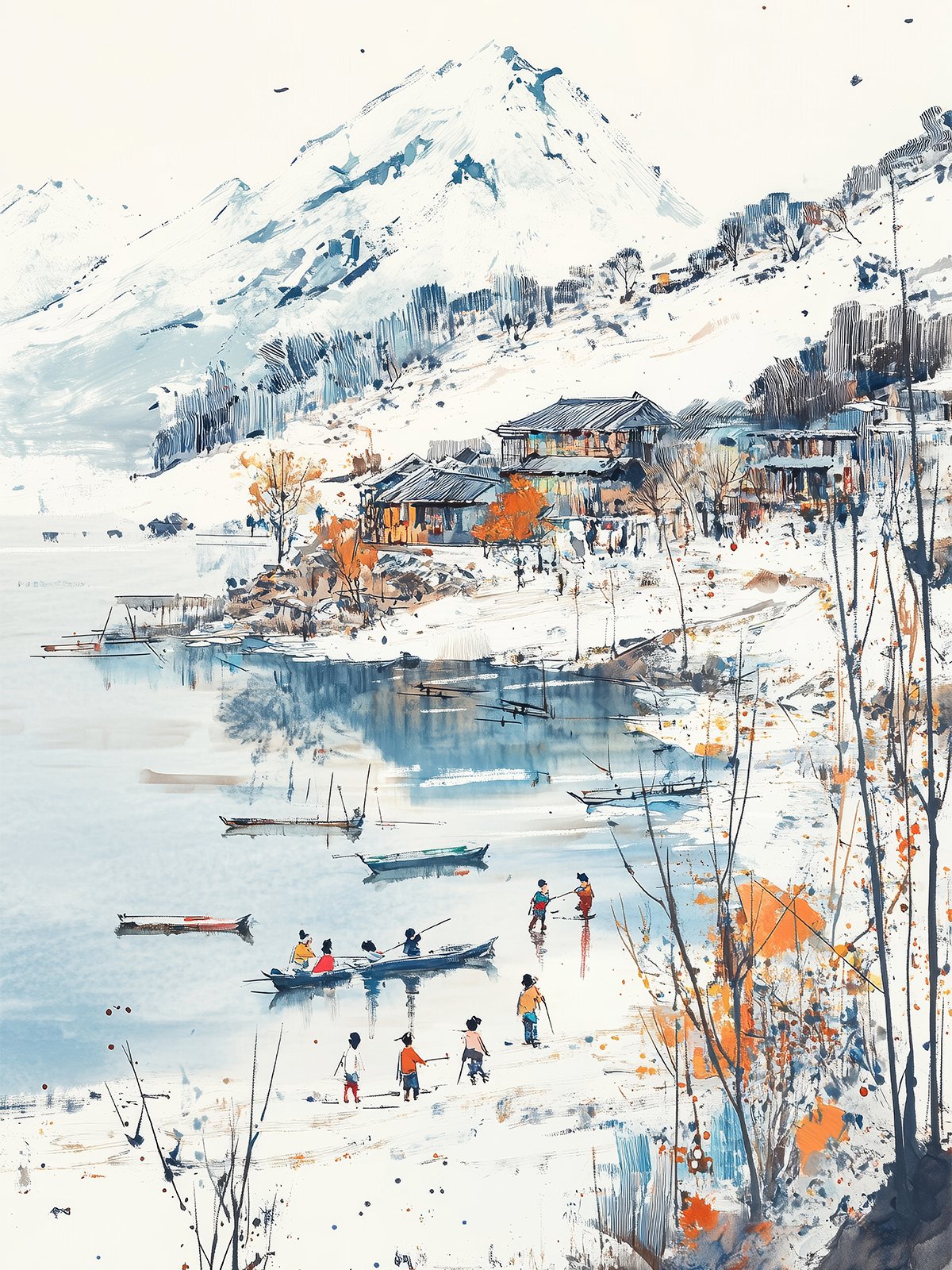 Montañas cubiertas de nieve rodean un pueblo junto al lago. Pequeñas barcas descansan cerca de la orilla mientras algunas figuras animan el paisaje. Los tonos fríos y cálidos se equilibran, transmitiendo serenidad y calma invernal.