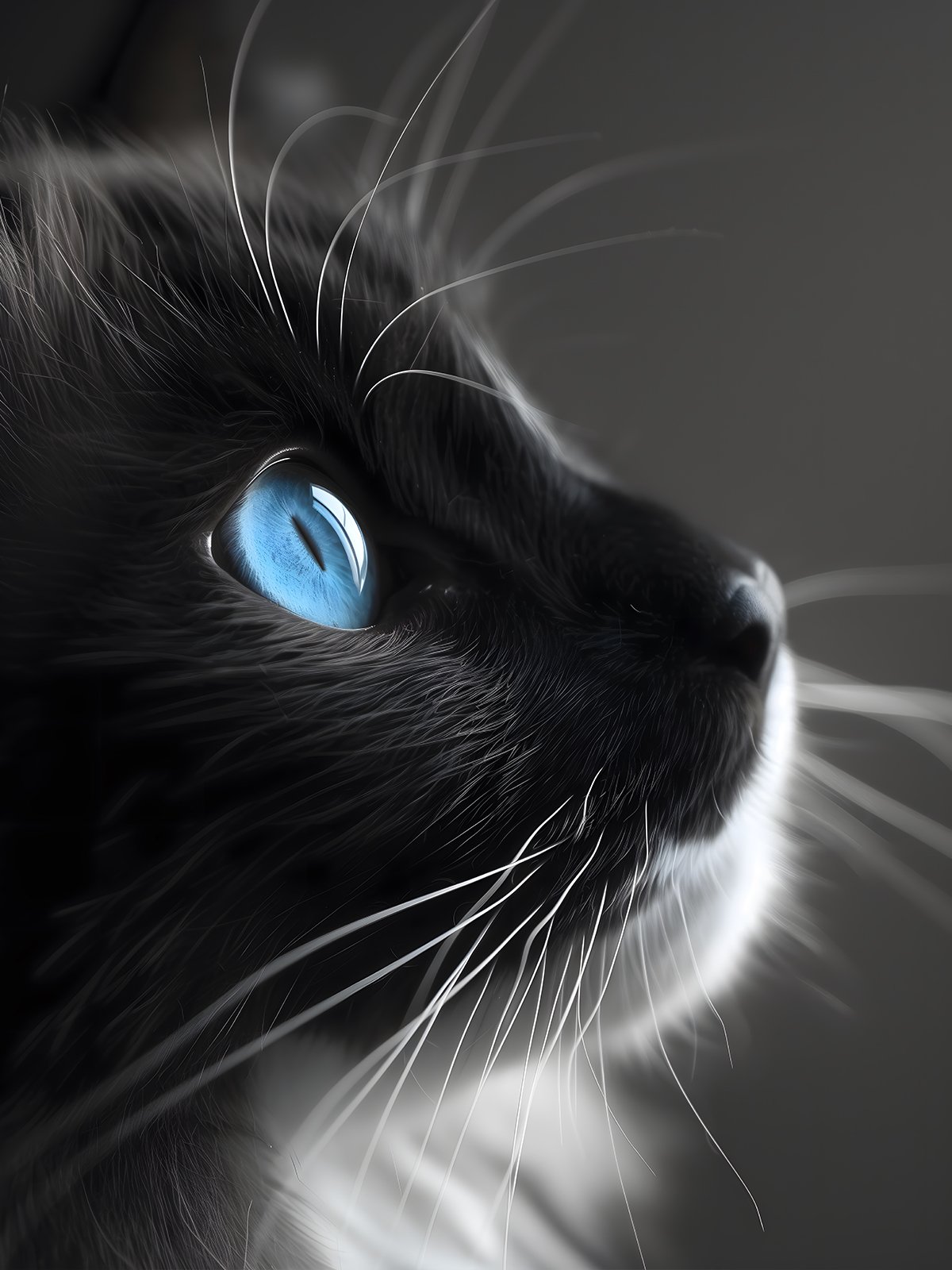 The escena focuses on a close-up of a cat. This cat has a pair of extremely eye-catching blue eyes, brillante and claro, gustar two crystal sapphires, which stand out contra the dim fondo. The overall picture is lleno of mystery and tranquilidad, haciendo personas querer to explorar the inner mundo of this cat más deeply.