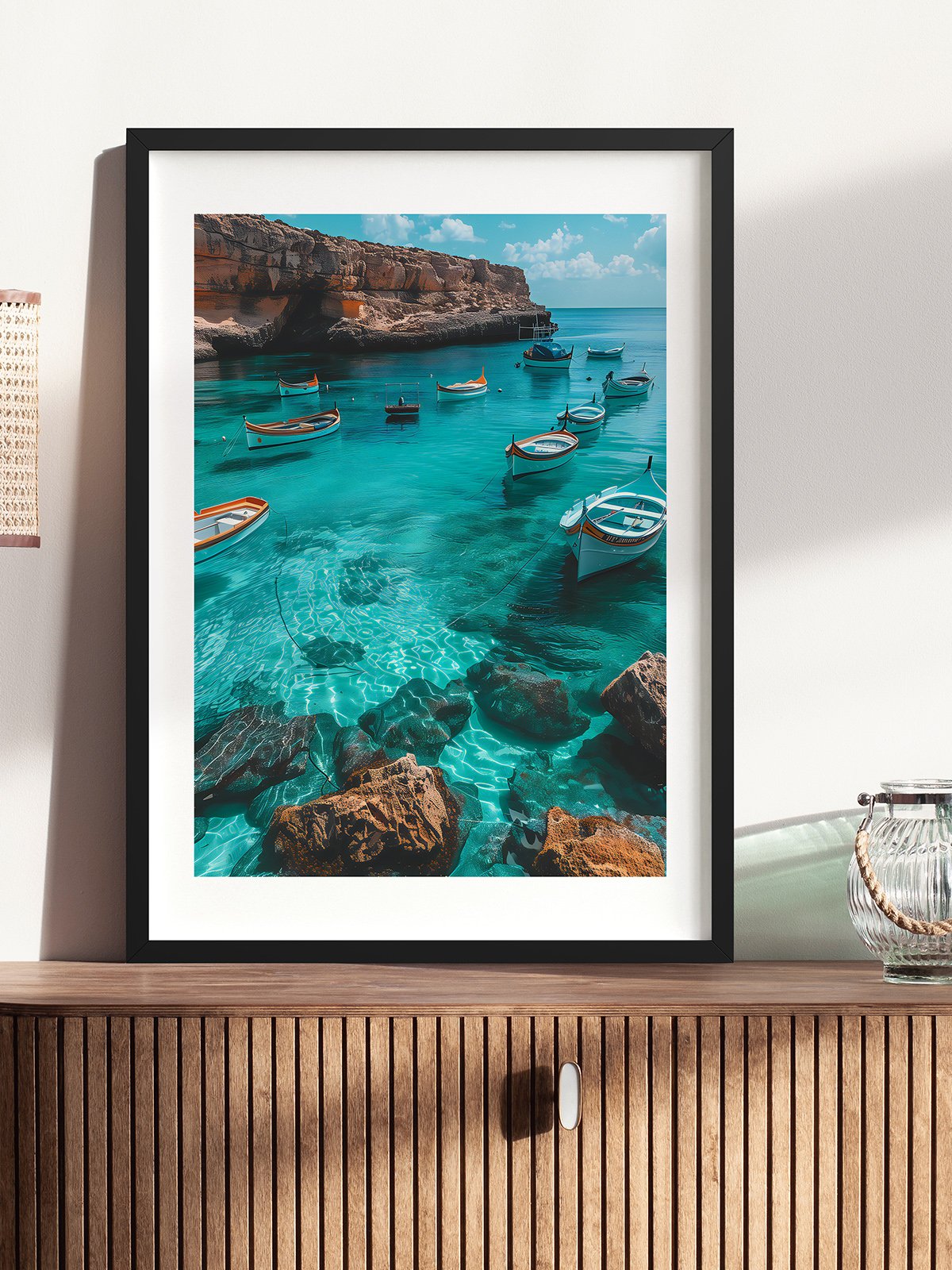 The crystal-clear blue agua reveals the rocks beneath and the reflejos of colorful barcos floating gently on the surface. The rocky cliffs along the costa are bathed in luz solar, mejorando their grandeza. The white nubes in the cielo contraste hermosamente with the blue of the mar, creando a serene and impresionante escena that seems to freeze tiempo in its beauty.