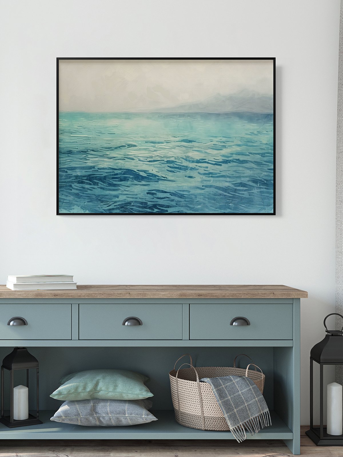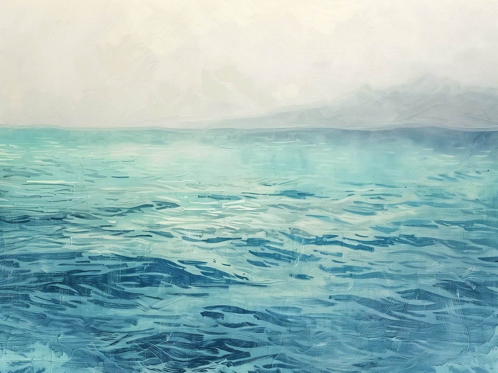 This pintura captura a serene océano, with the agua displaying layers of blue and green hues, gently rippling in the breeze. The distante horizon blends seamlessly with the cielo, creando a sentido of tranquilidad and vastness. The delicados and suave colors and brushstrokes hacer one sienten as if they are immersed in a quiet, expansive océano mundo, experiencing a profound sentido of calm and libertad.