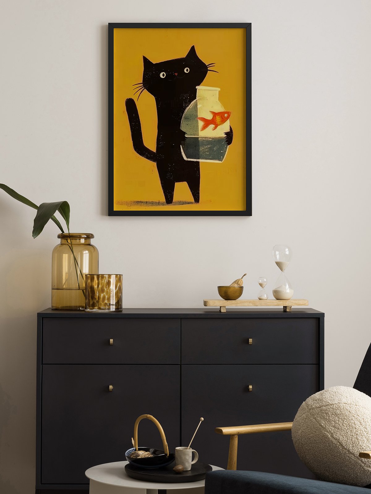 This pintura representa a black cat holding a glass jar with a goldfish adentro. The yellow fondo fills the image with calidez and playfulness, transmitiendo a sentido of innocence and alegría.