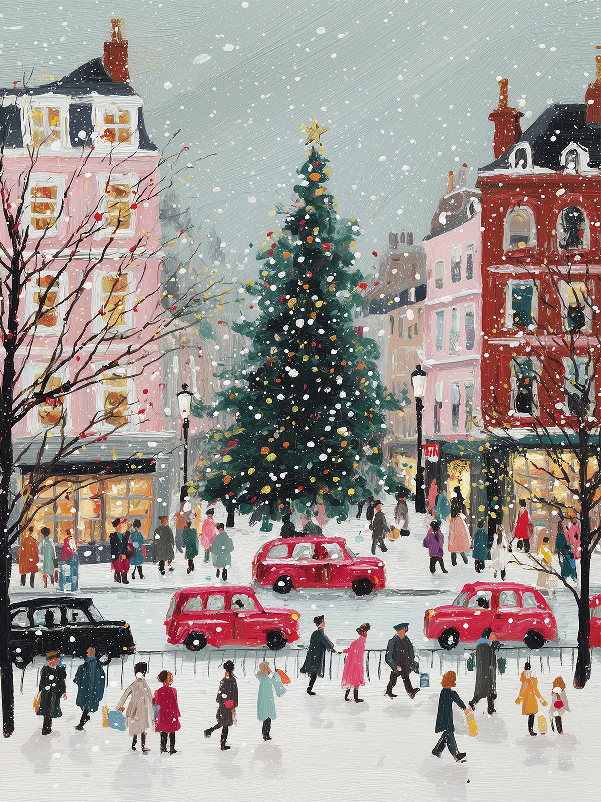 The escena portrays a festive calle with a alto Christmas tree at its centro, glowing with lights. Nieve falls gently as personas pasean and rojo buses pass by, creando a lively yet cozy atmosphere, gustar a cálido melody in the heart of invierno.