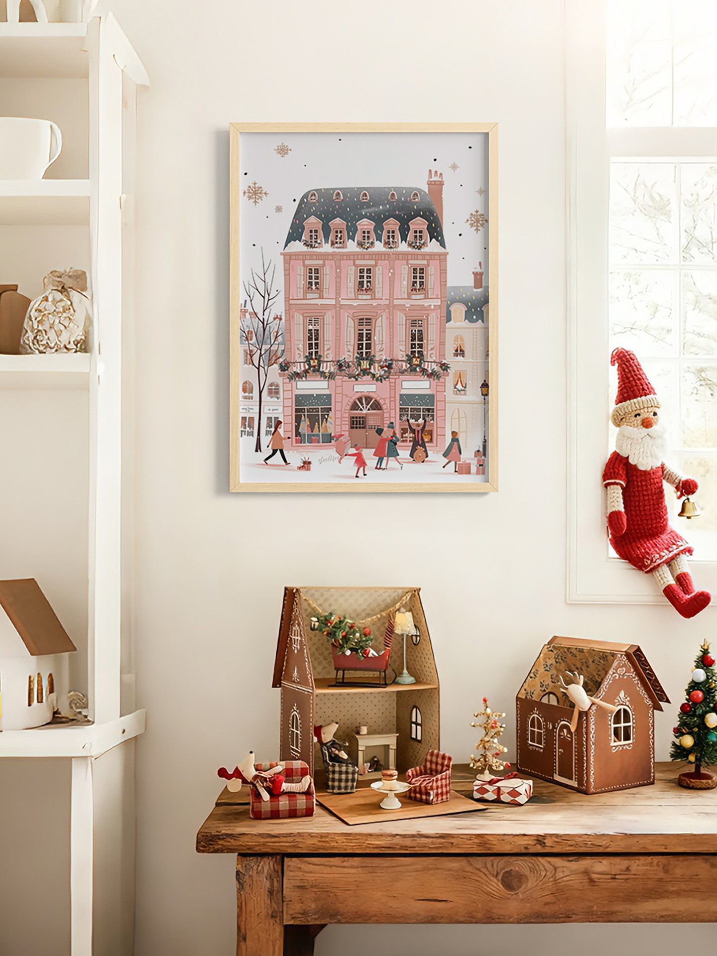 The artwork shows a pink Parisian construyendo glowing with cálido lights, while personas in invierno coats pasean the festive calle. A central Christmas tree, decorated with ornaments and lights, brings romance and fiesta cheer to the snowy noche.