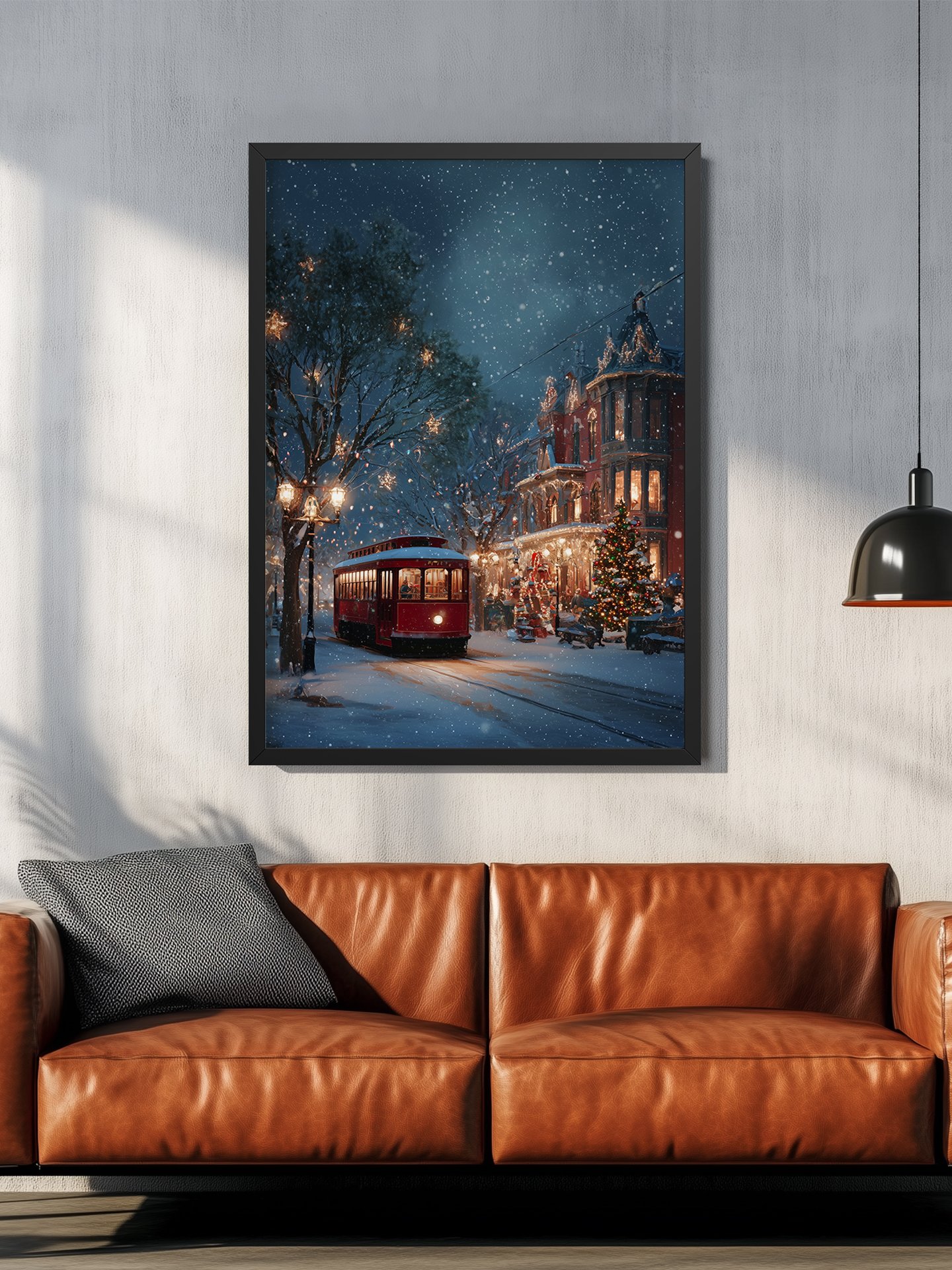 The pintura shows a rojo tram slowly passing through a snowy Christmas noche. The calle is illuminated with festive lights, houses are decorated with glowing Christmas trees, and snowflakes danza in the aire. The cálido glow and serene noche crear a magical fiesta atmosphere.