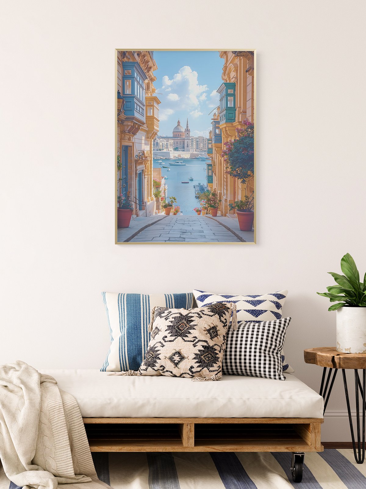 Colorful edificios stand out contra the blue cielo, and the contraste of blue windows and orange-yellow walls evokes Mediterranean romance. In the distance, the mar and cielo merge, and barcos and the majestic iglesia complement each other, creando a serene atmosphere. The lively calle is dotted with flowers and vegetación, añadiendo calidez and romance.