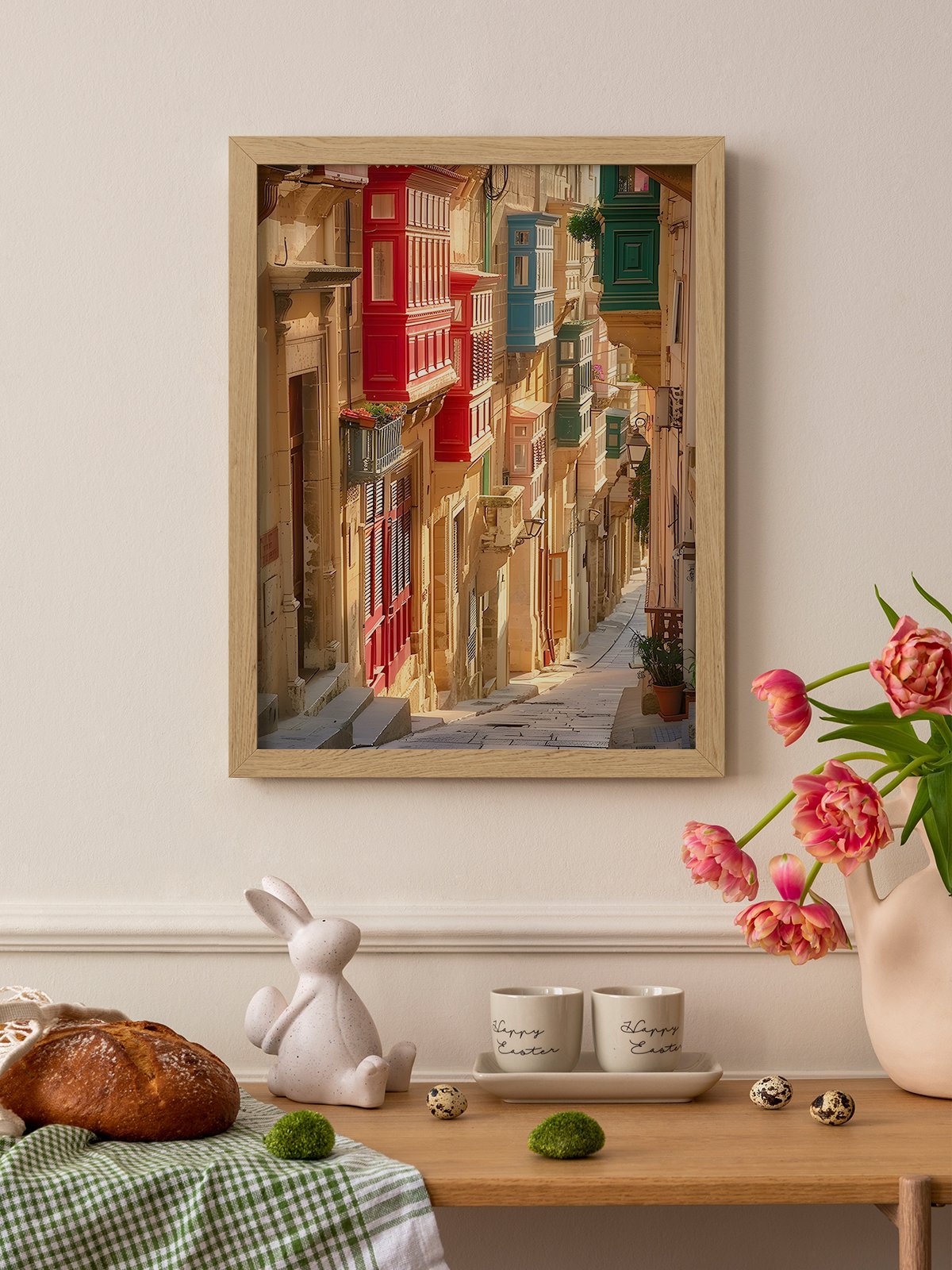 This photo shows an alleyway lleno of color and vida. The luz solar shines on the colorful windows and puerta frames, cálido and vivo. The rojo, blue and green windows are staggered, showing the único style of the Mediterranean ciudad. The whole alley is lleno of historical encanto and peaceful atmosphere, which is very pleasant.