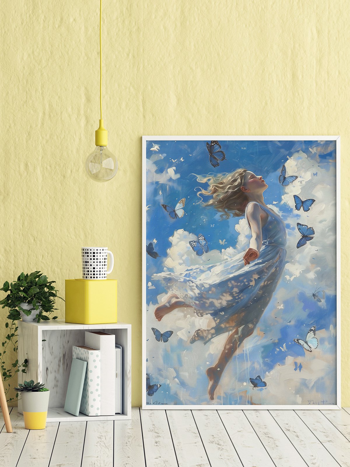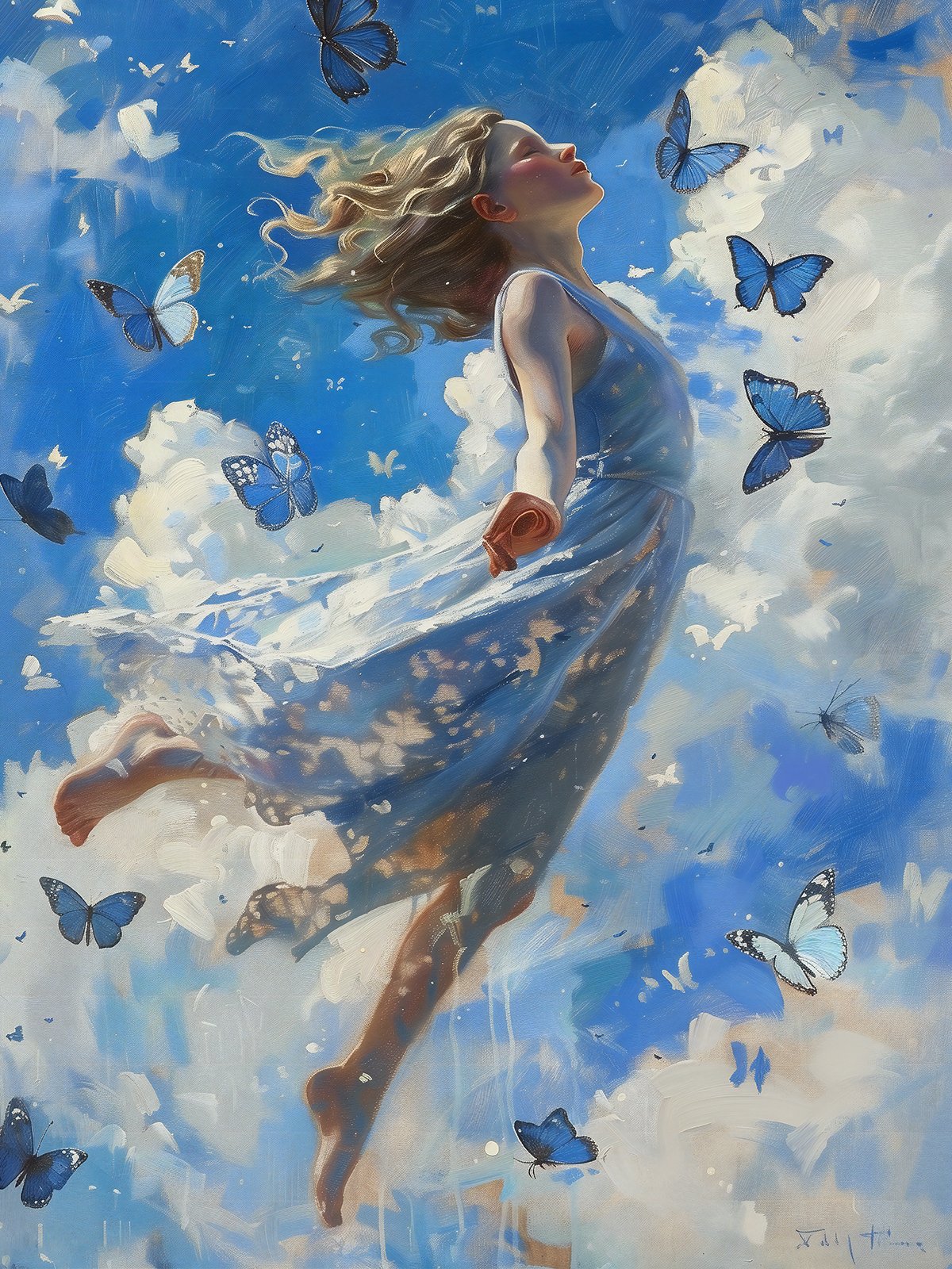 A niña in a blue dress is volando libremente in the cielo, surrounded by fluttering blue butterflies. The escena is filled with a sentido of fantasy and libertad, as if the niña is soaring through the blue cielo and white nubes, disfrutando the bliss of boundless libertad.