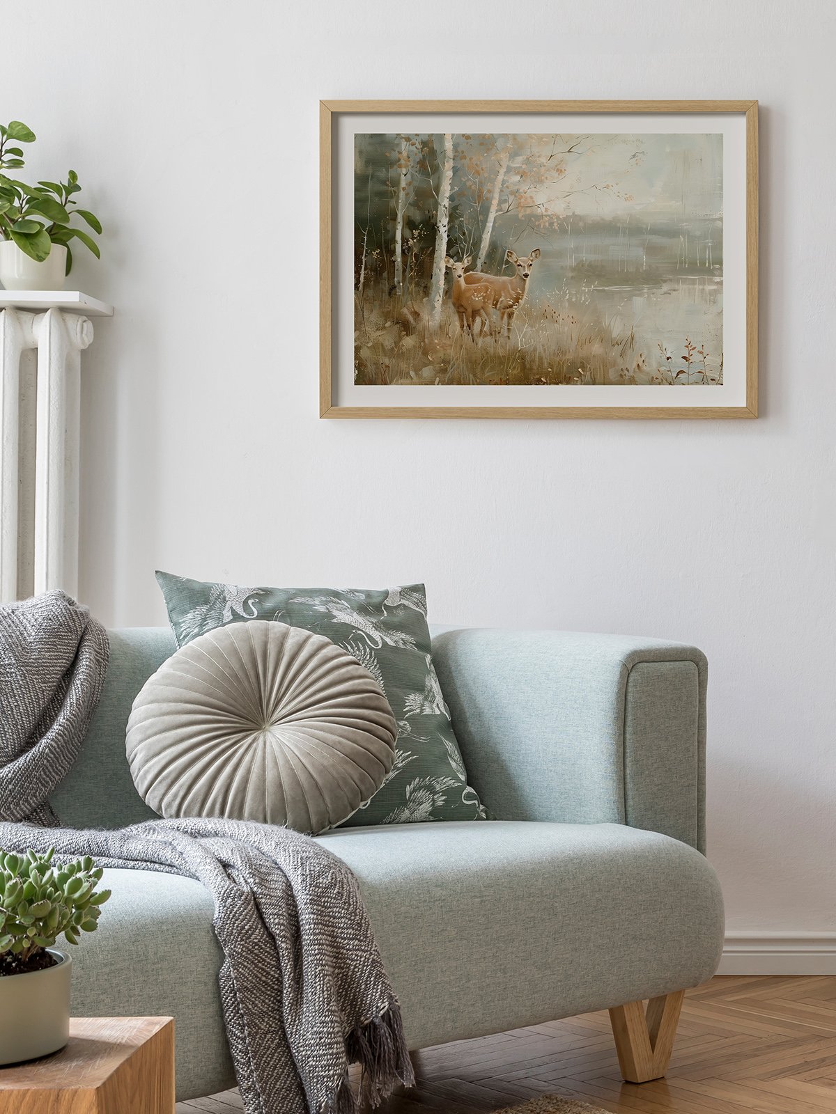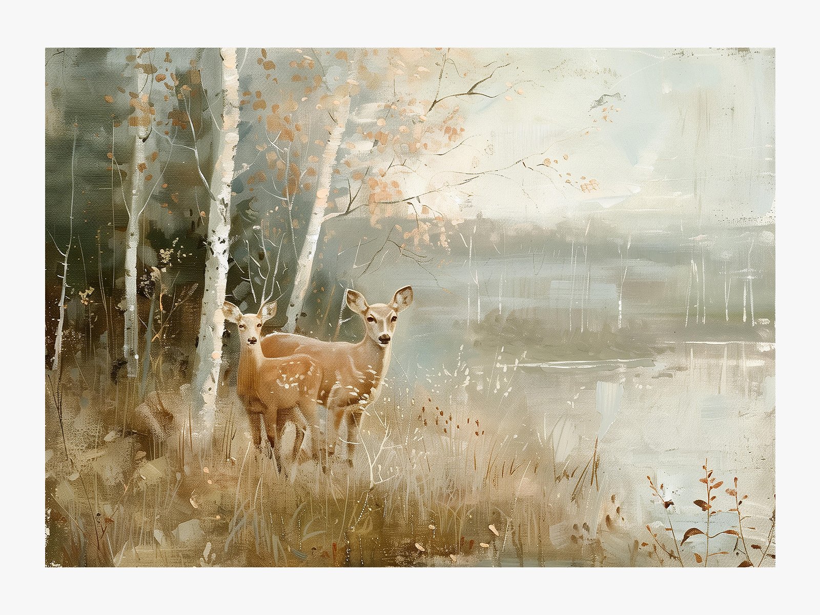 The image shows two joven deer in a serene bosque, surrounded by suave otoño luz and a tranquil lago. The cálido, gentle tones of the escena crear a peaceful and harmonious natural atmosphere, as if tiempo has paused in this momento.