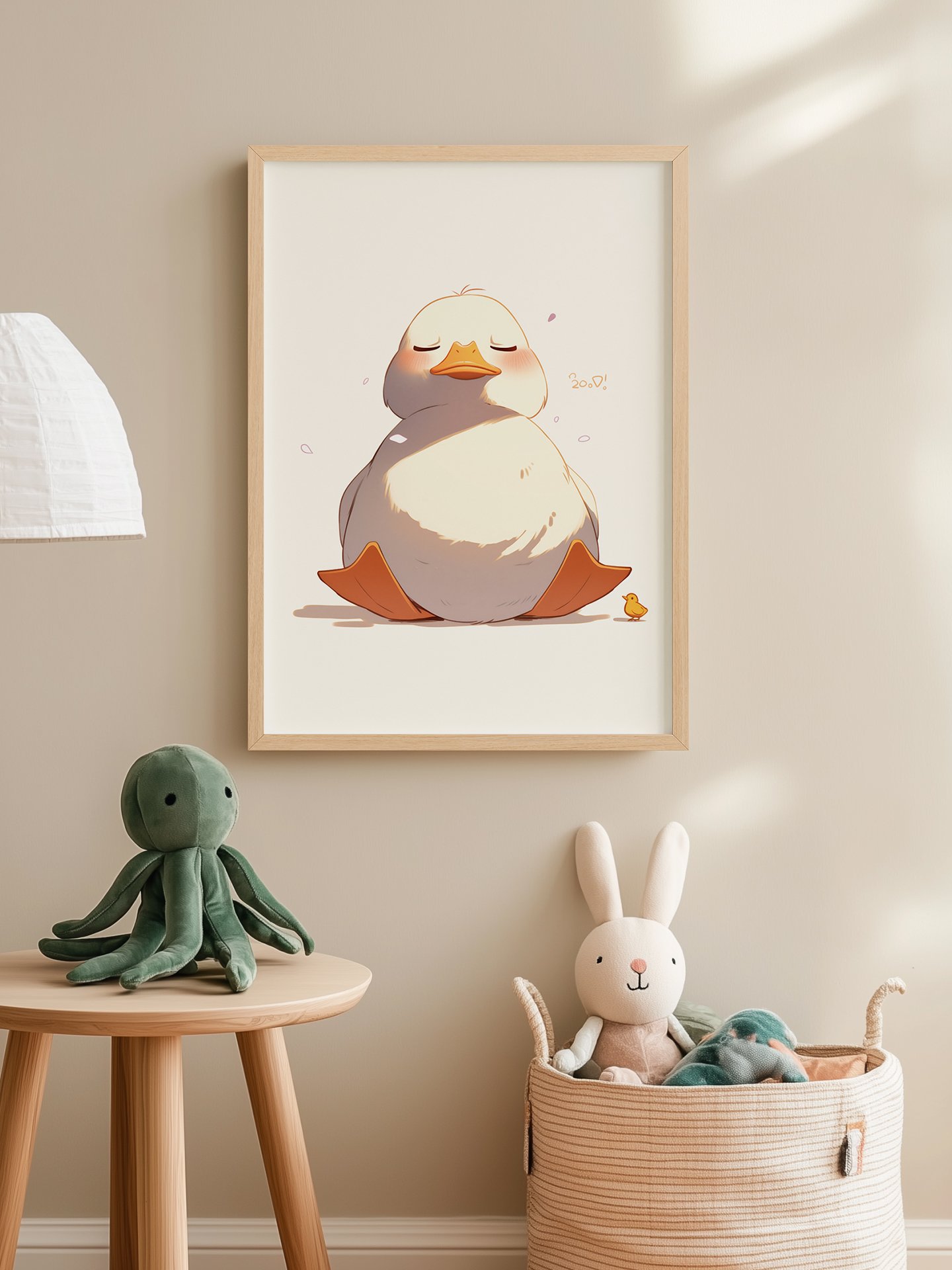 En la imagen, un pato gordito tiene los ojos cerrados y lleva una sonrisa, viéndose muy cómodo. A su lado hay un patito amarillo. La imagen es cálida y linda, agregando un ambiente cálido al hogar.