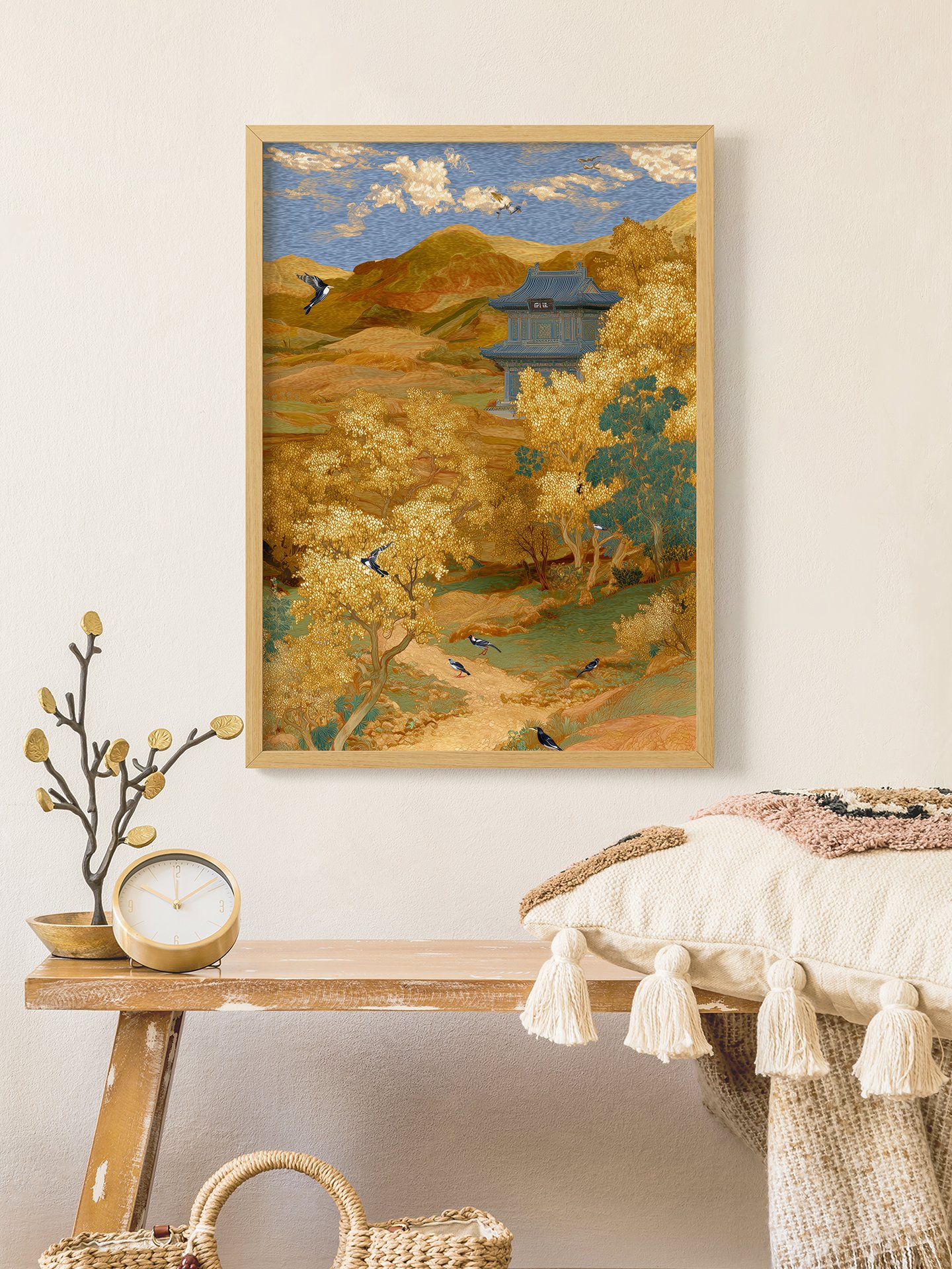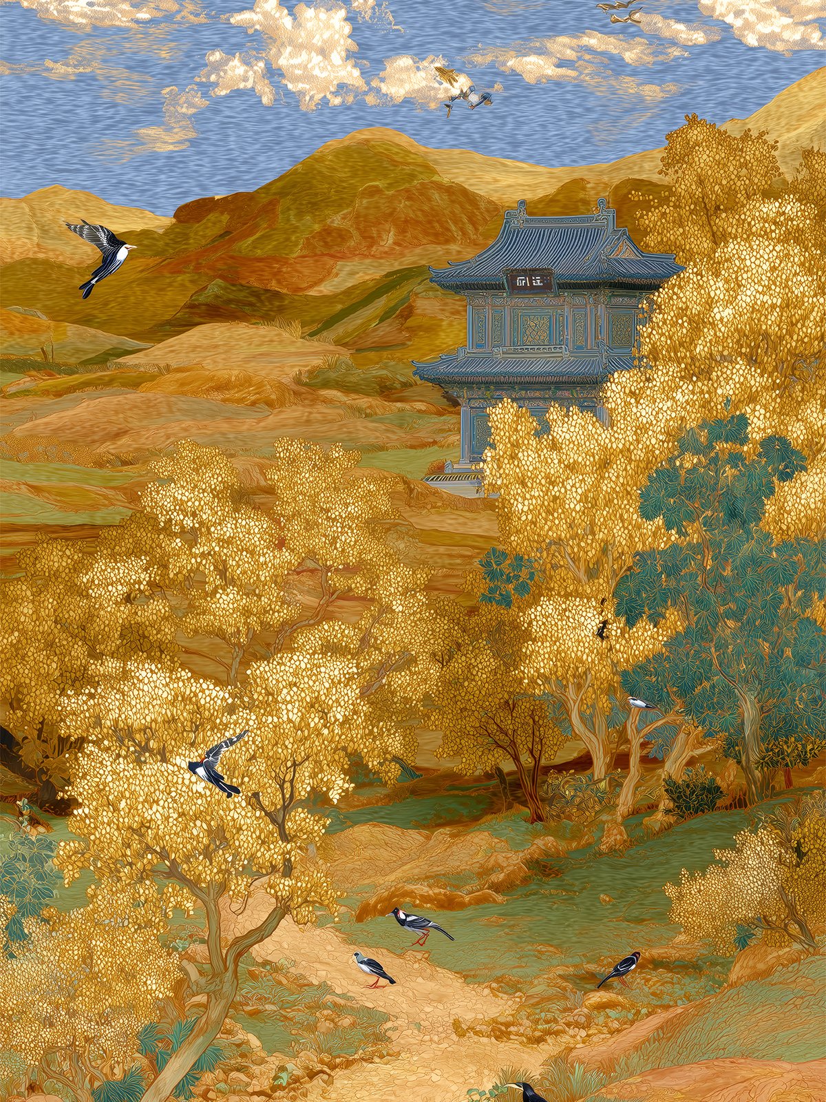 Bosques dorados cubren las colinas mientras un templo antiguo se alza en silencio. Aves cruzan el cielo y los tonos cálidos se mezclan con verdes suaves, transmitiendo serenidad, equilibrio y poesía otoñal.