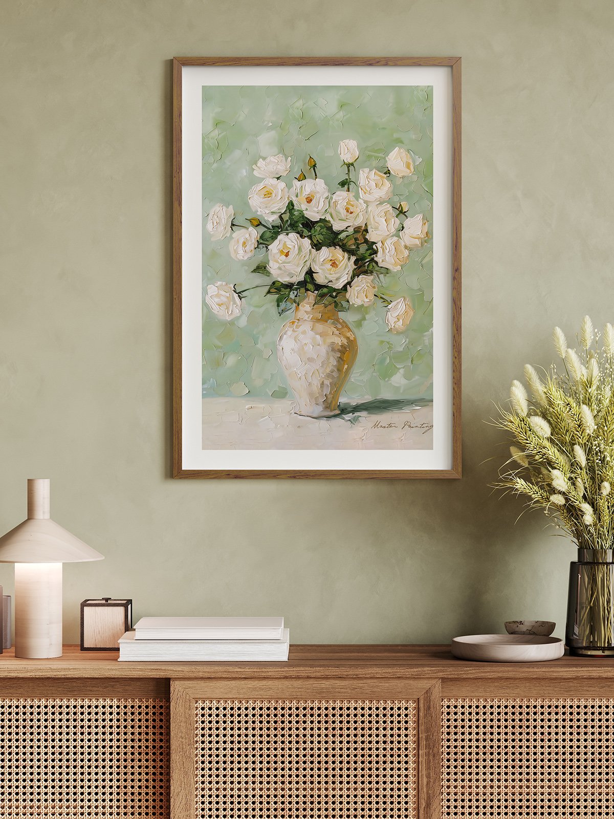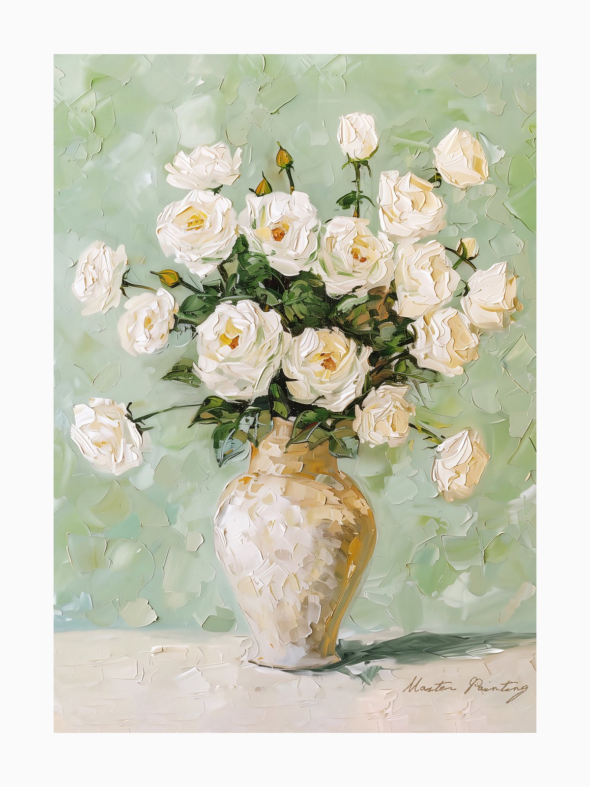 This pintura representa a bouquet of puro white roses blooming in a simple vase, with petals so delicately layered that you can almost smell their fragrance. The suave green fondo highlights the purity and elegance of the roses, creando a serene and graceful atmosphere.