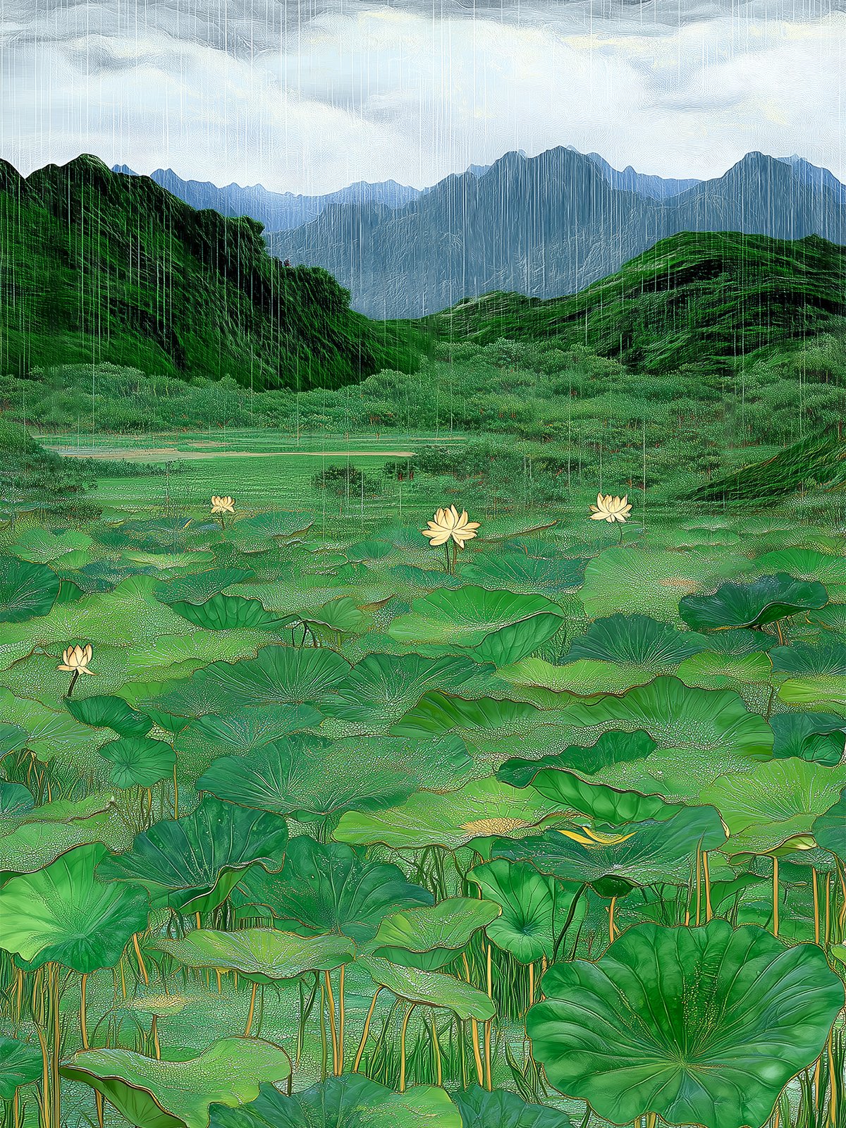 Una lluvia ligera cae sobre un estanque de lotos, donde las hojas se extienden sobre el agua y flores amarillas florecen en silencio. Ondas suaves recorren la superficie mientras las montañas se envuelven en neblina, transmitiendo serenidad y equilibrio natural.
