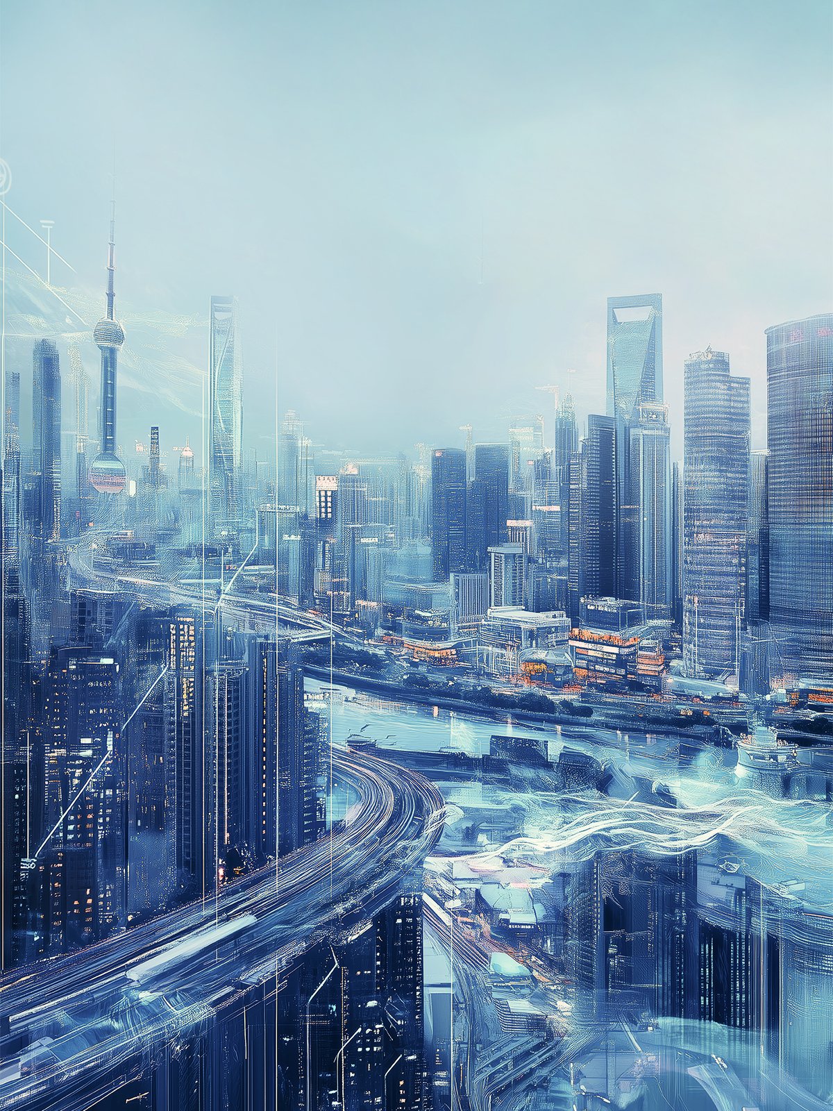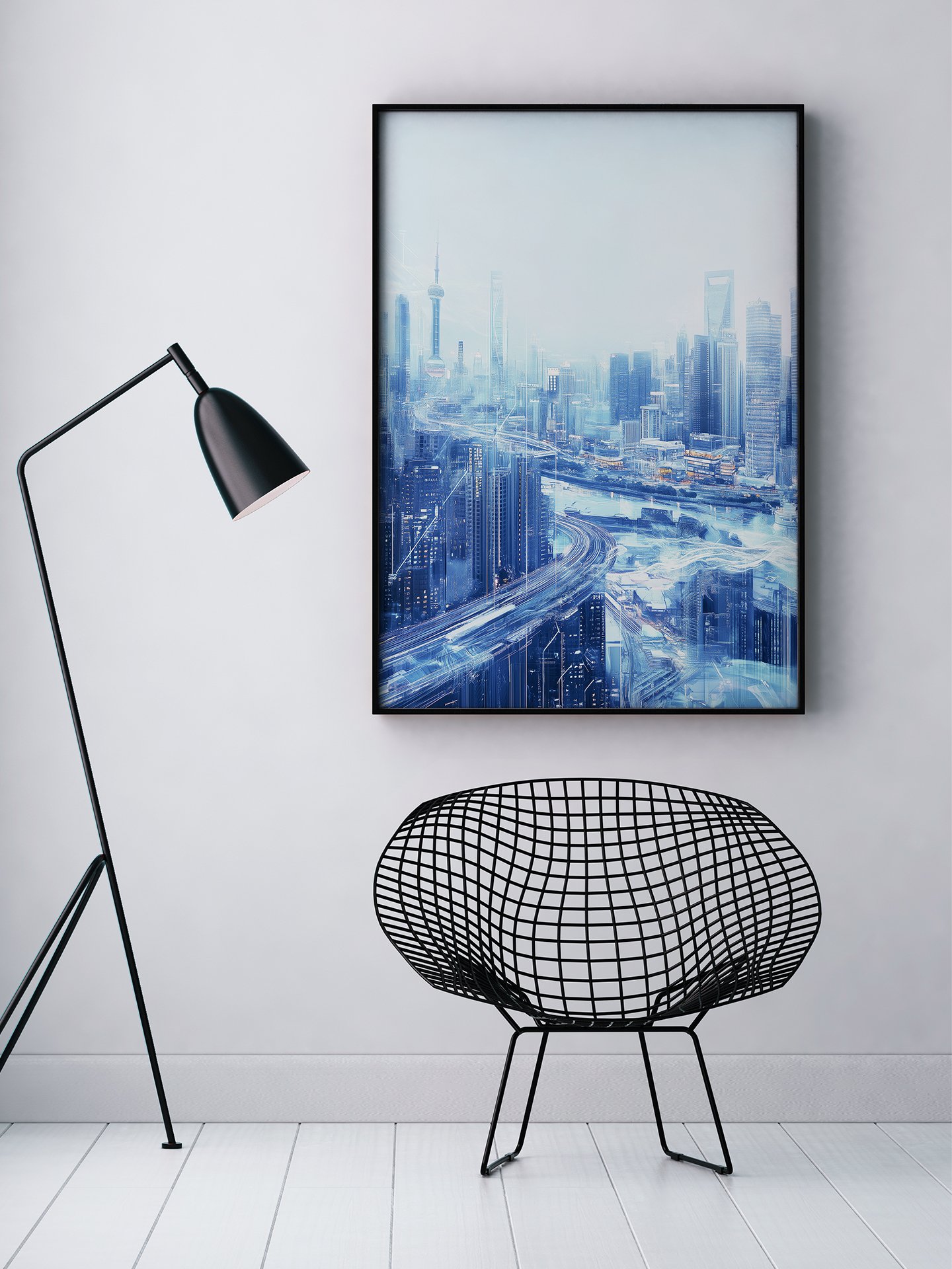 Esta pintura decorativa presenta una fantasía digital de una metropolis futura, con rascacielos imponentes y carreteras serpenteantes entrelazadas. Los tonos azules y los efectos de iluminación crean una sensación de tecnología y futurismo, como si se estuviera inmerso en un mundo virtual.