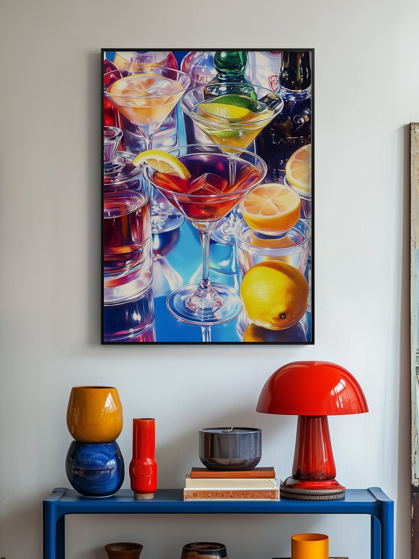 ‌Esta pintura muestra un festín de cocteles vibrante, con copas cristalinas llenas de deslumbrantes tonos rojos, amarillos y más, adornadas con rodajas de limón y cubitos de hielo, mientras botellas se perfilan en el fondo. La escena irradia un ambiente alegre, invitando a un delicioso encuentro embriagador.