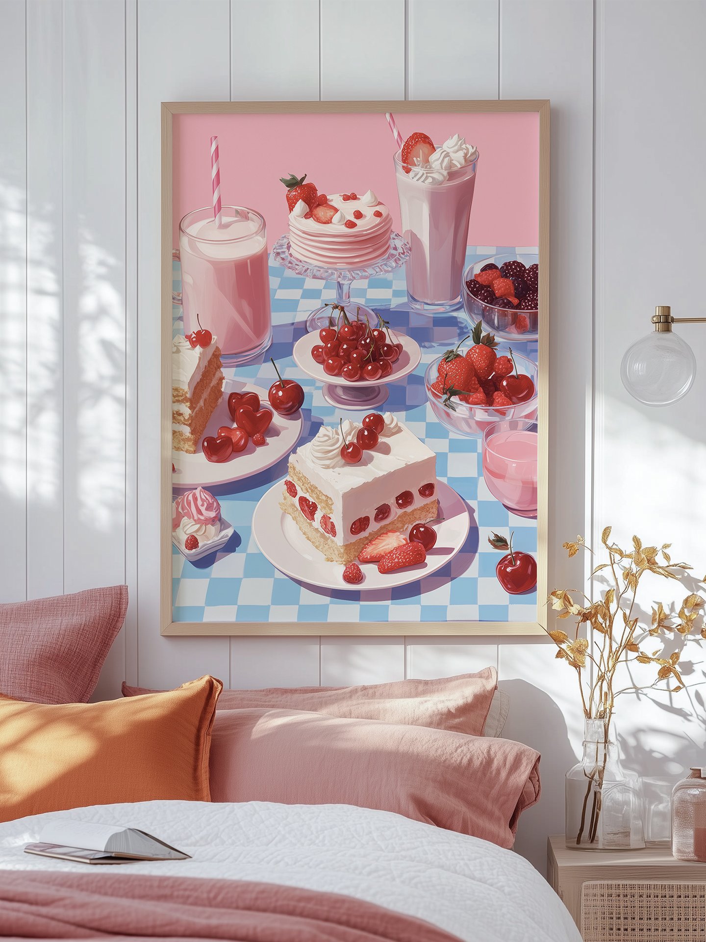 Esta pintura decorativa presenta un festín de postres de bayas y cerezas, con exquisitos pasteles adornados con cerezas rojas brillantes y crema, acompañados de batidos de fresa frescos y bayas variadas, creando un espectáculo colorido y apetitoso para los amantes de los postres.
