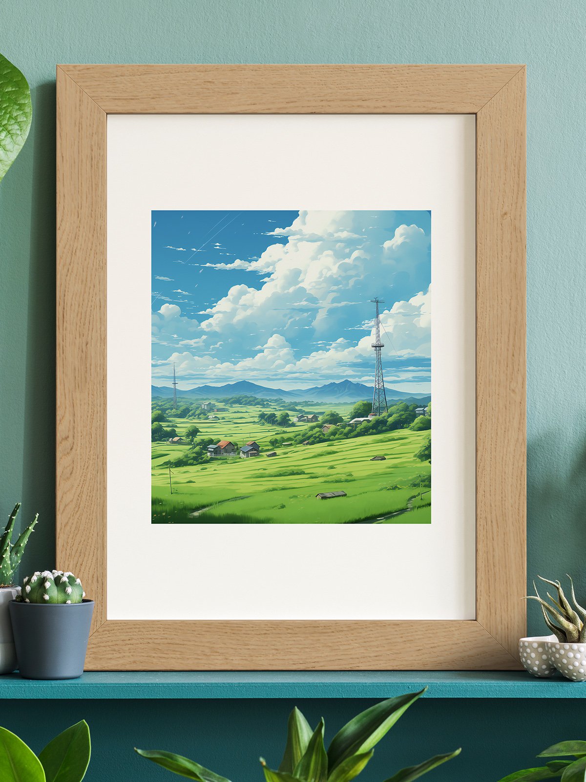 This pintura representa a vast field, exuberante and green, under a alto cielo with white nubes. The rural paisaje under the blue cielo appears especially serene and peaceful. The distante mountains and towering poder poles add profundidad and a touch of modernity, evoking a sentido of the beauty and tranquilidad of naturaleza.