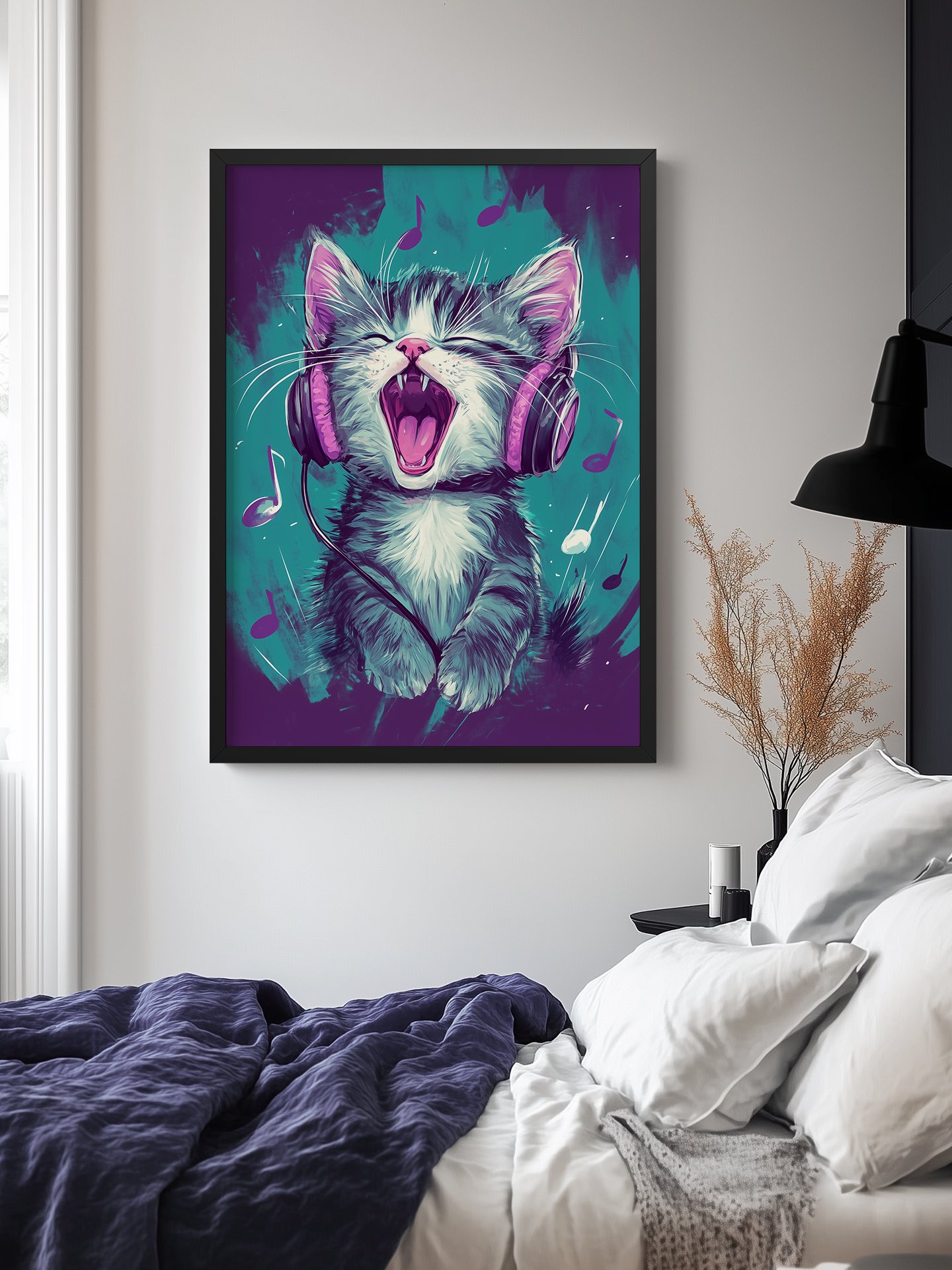 ‌Gatito gris con auriculares rosas, los ojos cerrados y la boca abierta en éxtasis musical, bigotes temblando, con notas púrpuras flotantes y fondo degradado azul-verde. Divertido y curativo, transmite una atmósfera de alegría musical, añadiendo calidez y vitalidad a cualquier hogar.
