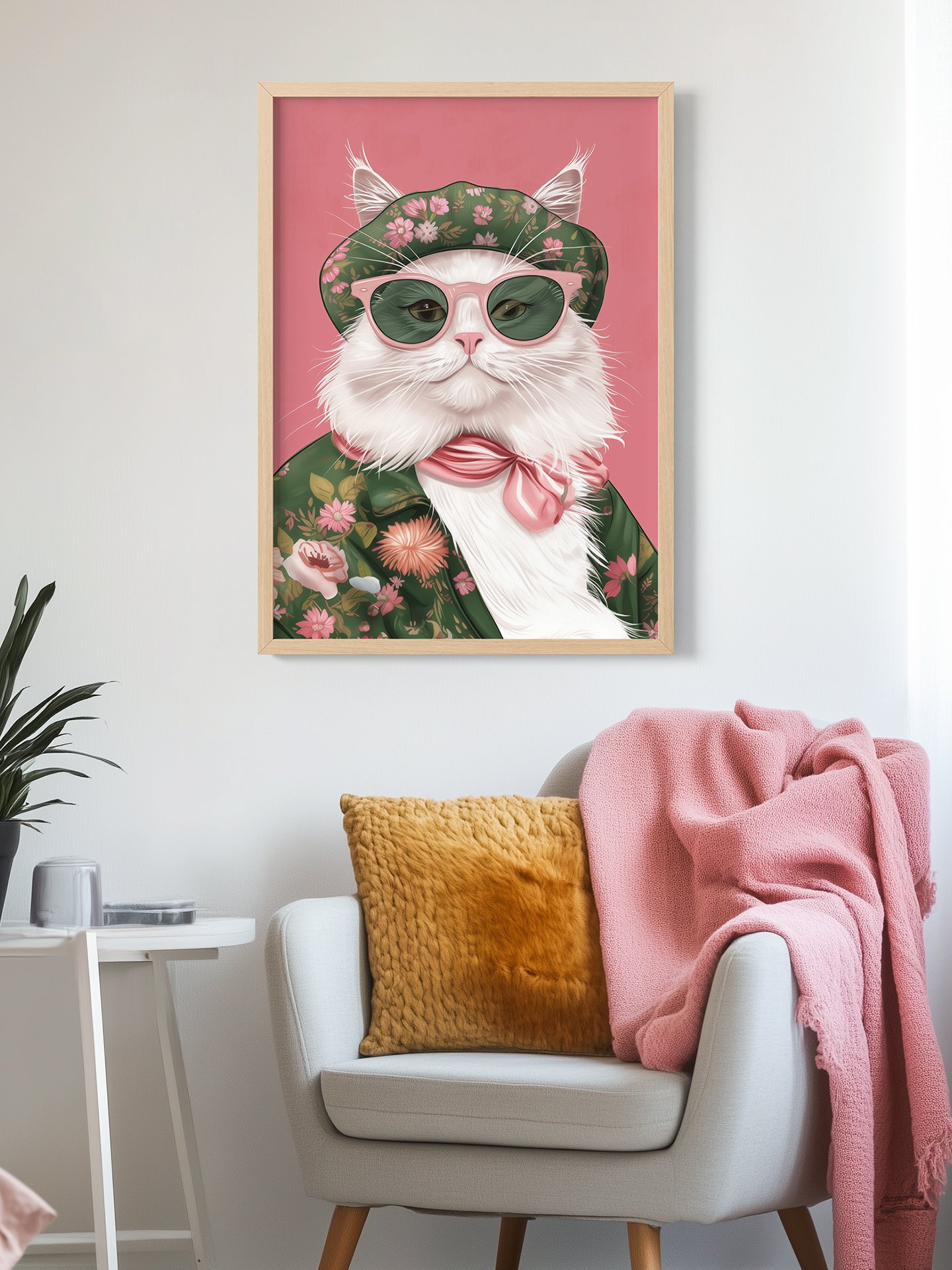 En la imagen, un gato blanco es muy de moda. Lleva un boina con motivos floreados verdes, gafas de sol rosas, una camisa con motivos floreados verdes y un lazo rosado. El fondo de color rosa suave lo hace verse extremadamente adorable y juguetón.