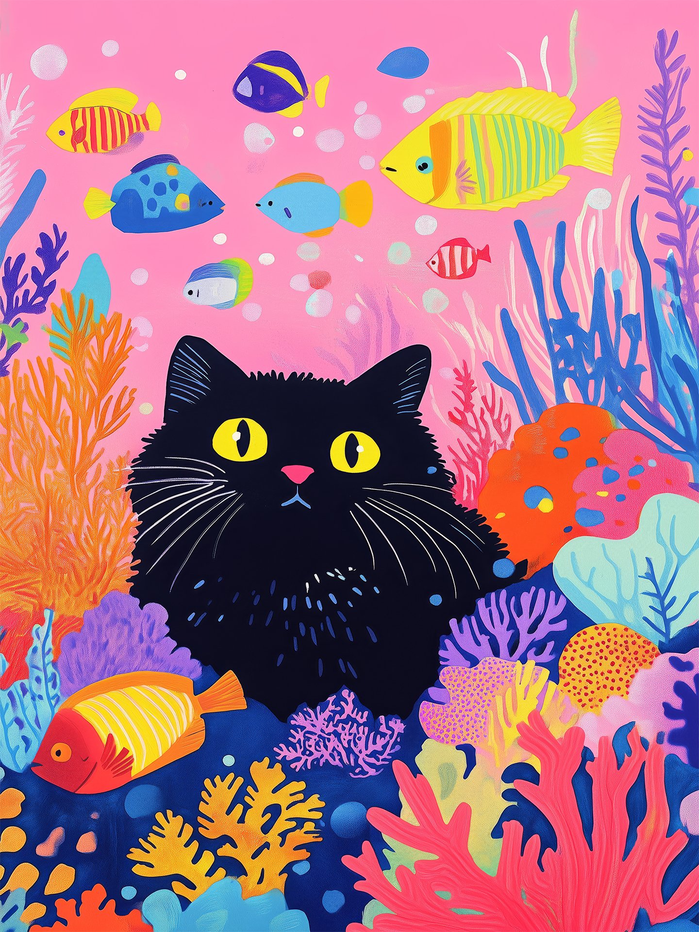 En esta pintura, un gato negro se encuentra en un vibrante mundo submarino, rodeado de diversos peces tropicales nadando a su alrededor. Los arrecifes de coral son ricos en color y diversos en forma. El gato negro, con ojos abiertos de par en par, explora curiosamente este reino secreto fantástico, llenando la escena de fantasía e imaginación.