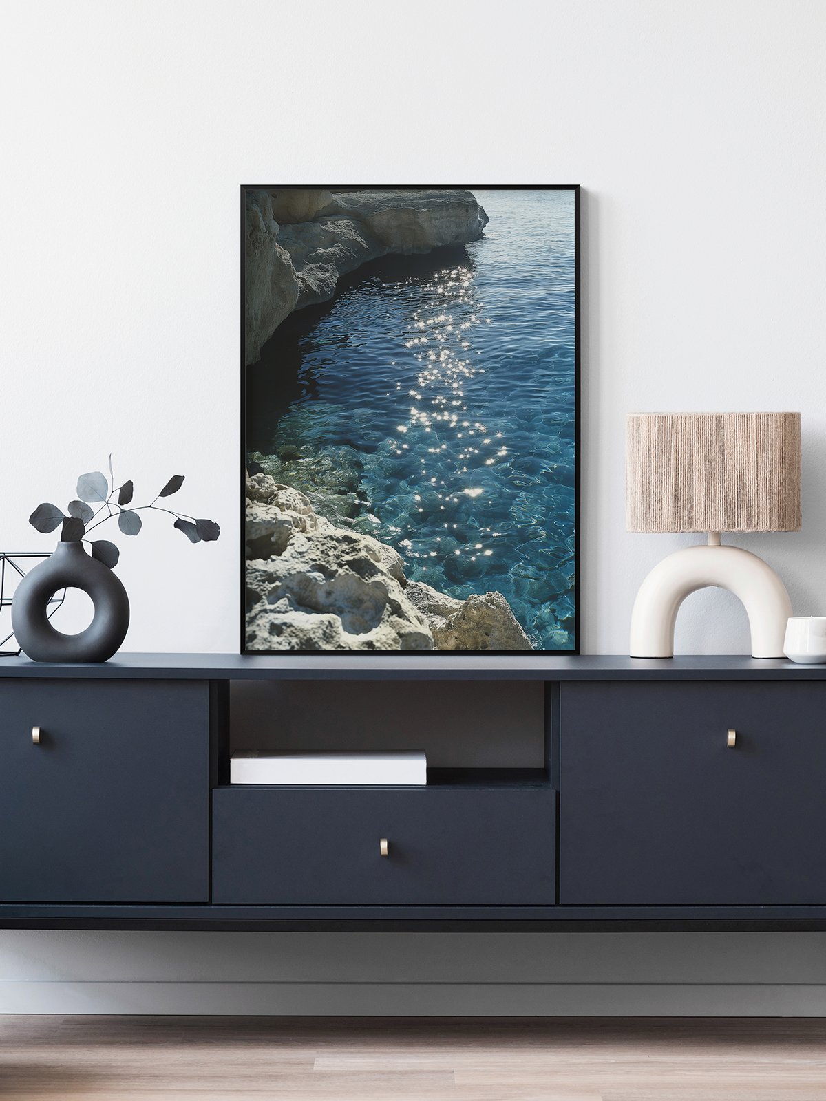 Glittering lights shimmer in the agua, resembling stars descending to tierra, adorning this mysterious blue. This photograph captura the perfecto blend of agua and luz, evoking a sentido of tranquilidad and beauty that transcends reality.