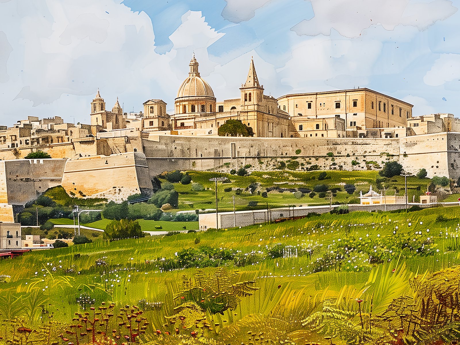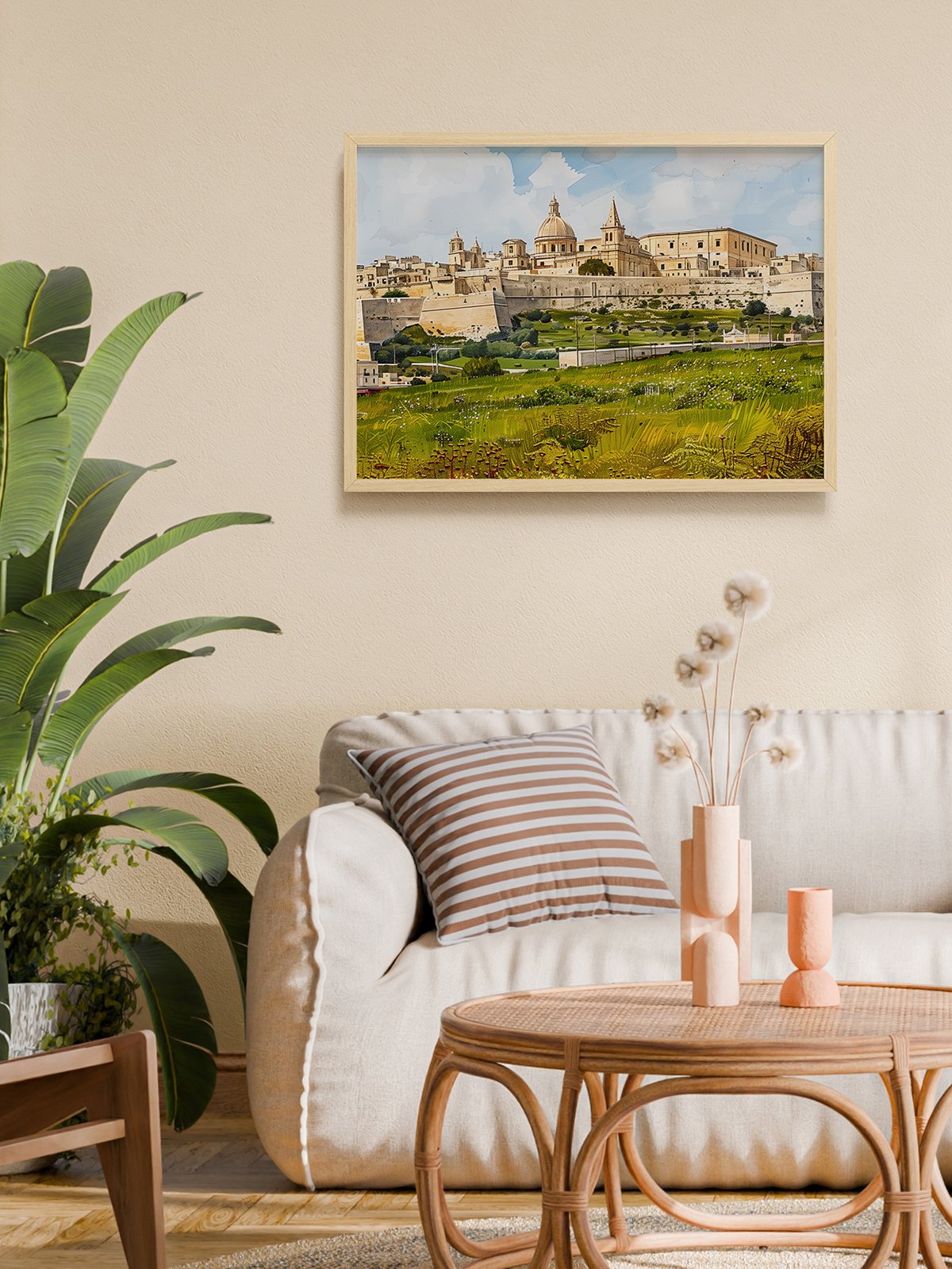 This serie of artworks showcases the grandeza of an antiguo ciudad in Malta, with towering walls and magnífico edificios. The blue cielo contrasts hermosamente with the green meadows, evoking a sentido of tranquilidad and timelessness. The iglesia dome and spires in the distance symbolize the witness of historia and the poder of fe. This artwork, with its delicados strokes and rich colors, highlights the splendor and beauty of the antiguo ciudad of Malta, haciendo one sienten transported atrás to that historical era.