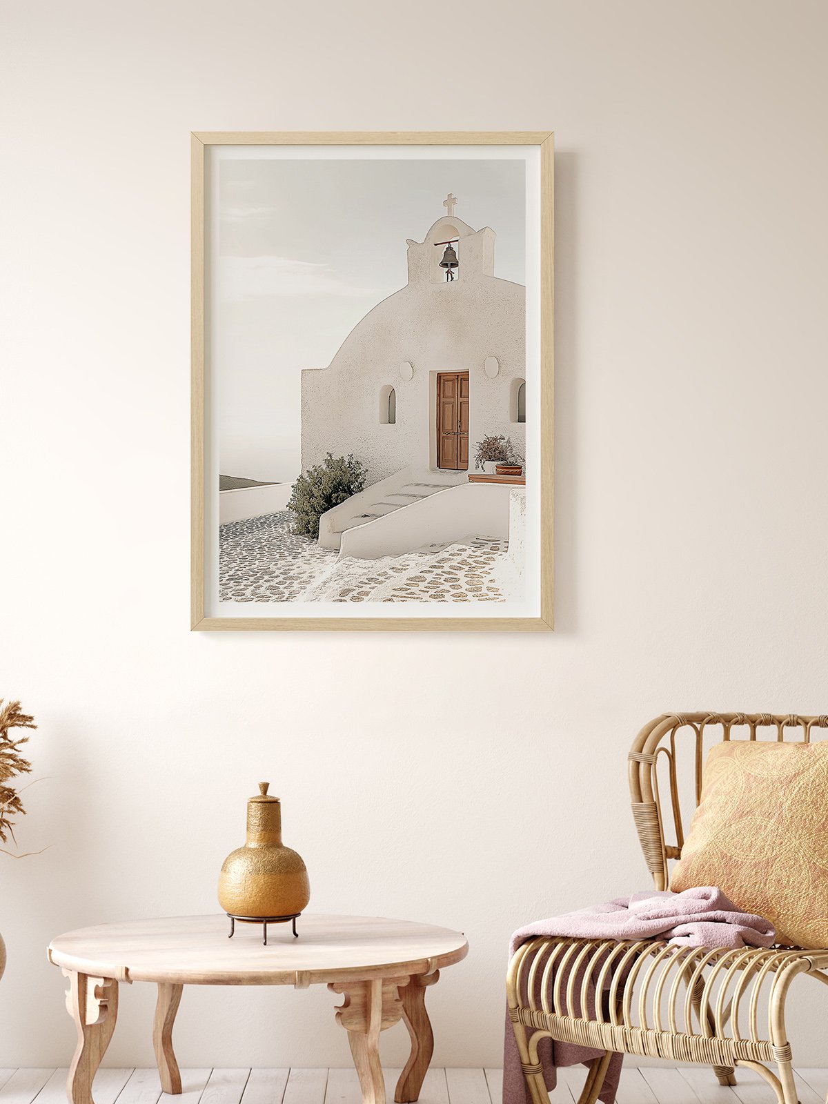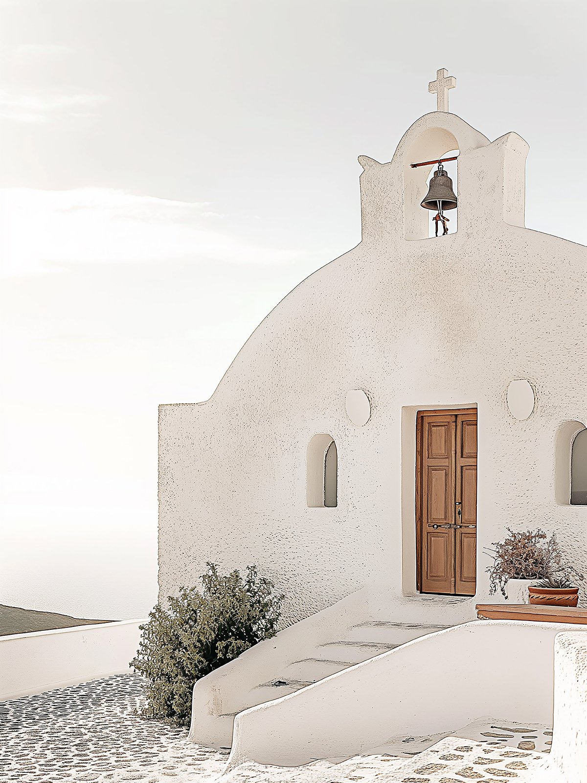 A white-walled, blue-domed Greek-style iglesia stands quietly on the azure costa. The mar breeze gently blows, and the bell tolls melodiously, telling antiguo legends and guarding the paz of the mar.