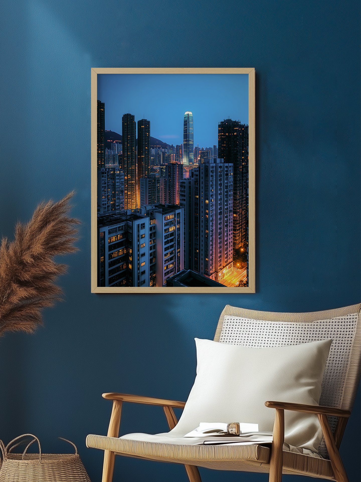 Con la noche avanzando, los rascacielos se elevan bajo un cielo azul profundo. Una torre central marca el ritmo urbano, mientras las luces y calles expresan orden, vitalidad y la fuerza silenciosa de la ciudad.