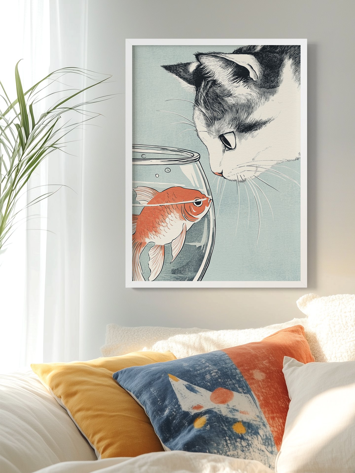 ‌En la imagen, un gato se acerca curiosamente al pecero y mira al pez de colores dentro. Los ojos del gato están concentrados y el pez también parece darse cuenta. Toda la imagen está llena de diversión, agregando un ambiente dinámico al hogar.