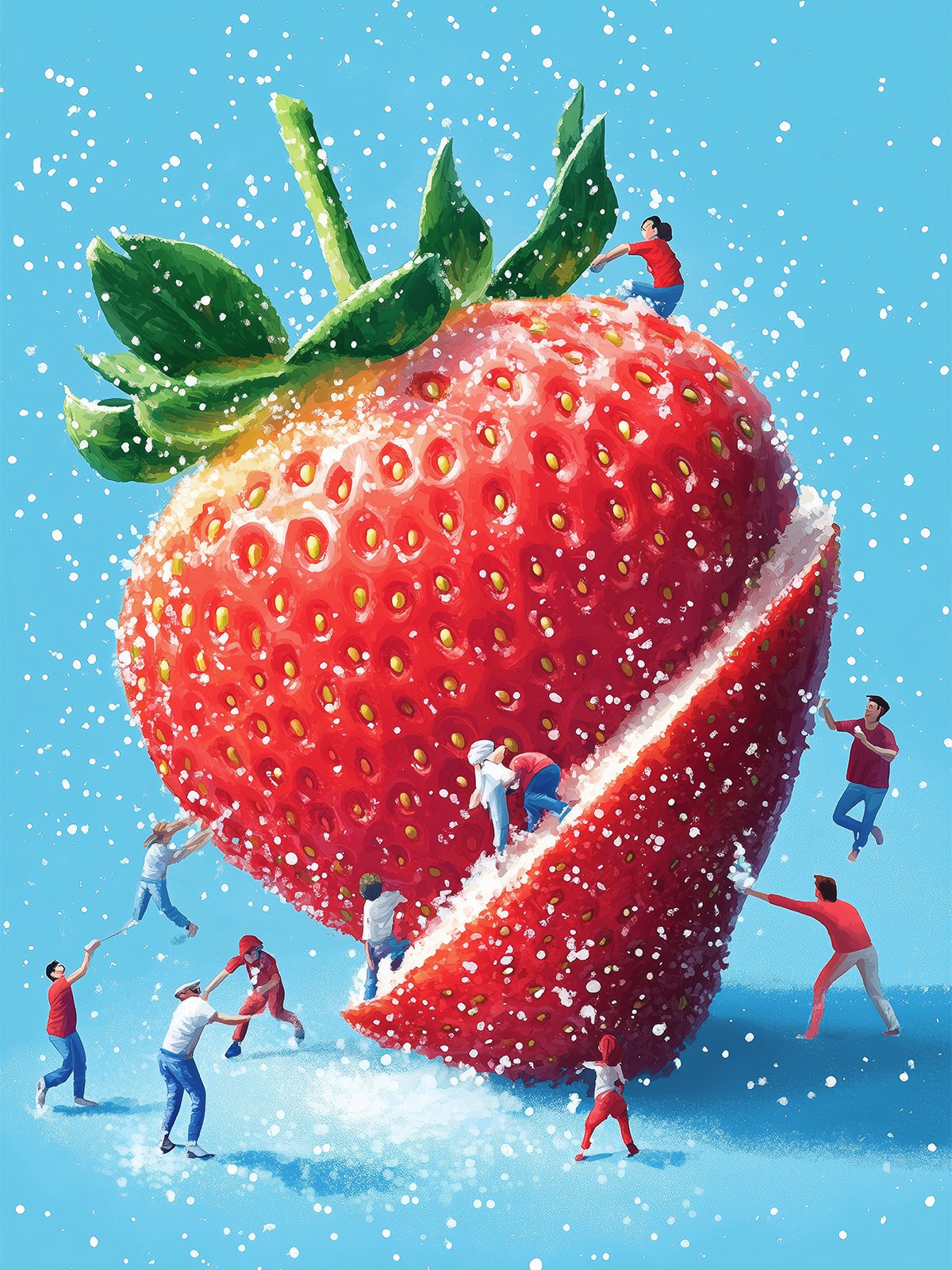 Una enorme fresa domina la escena mientras pequeñas personas cooperan para cortarla y compartirla. El rojo intenso del fruto contrasta con el fondo azul y las motas blancas que flotan en el aire, aportando dinamismo y fantasía. La imagen transmite alegría, creatividad y un espíritu lúdico, evocando la dulzura de la vida y la belleza de trabajar juntos.