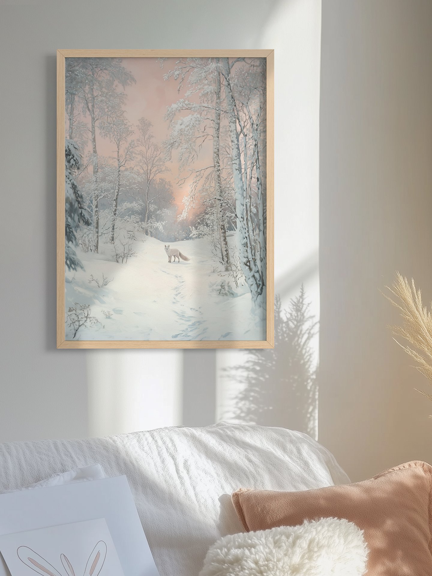 La imagen muestra un bosque cubierto de nieve con árboles nevados y un sendero serpenteante. Un zorro se erige con gracia entre ellos. Frente al suave cielo de color rosáceo – anaranjado, crea una atmósfera serena y onírica, agregando un toque cálido y poético al espacio.