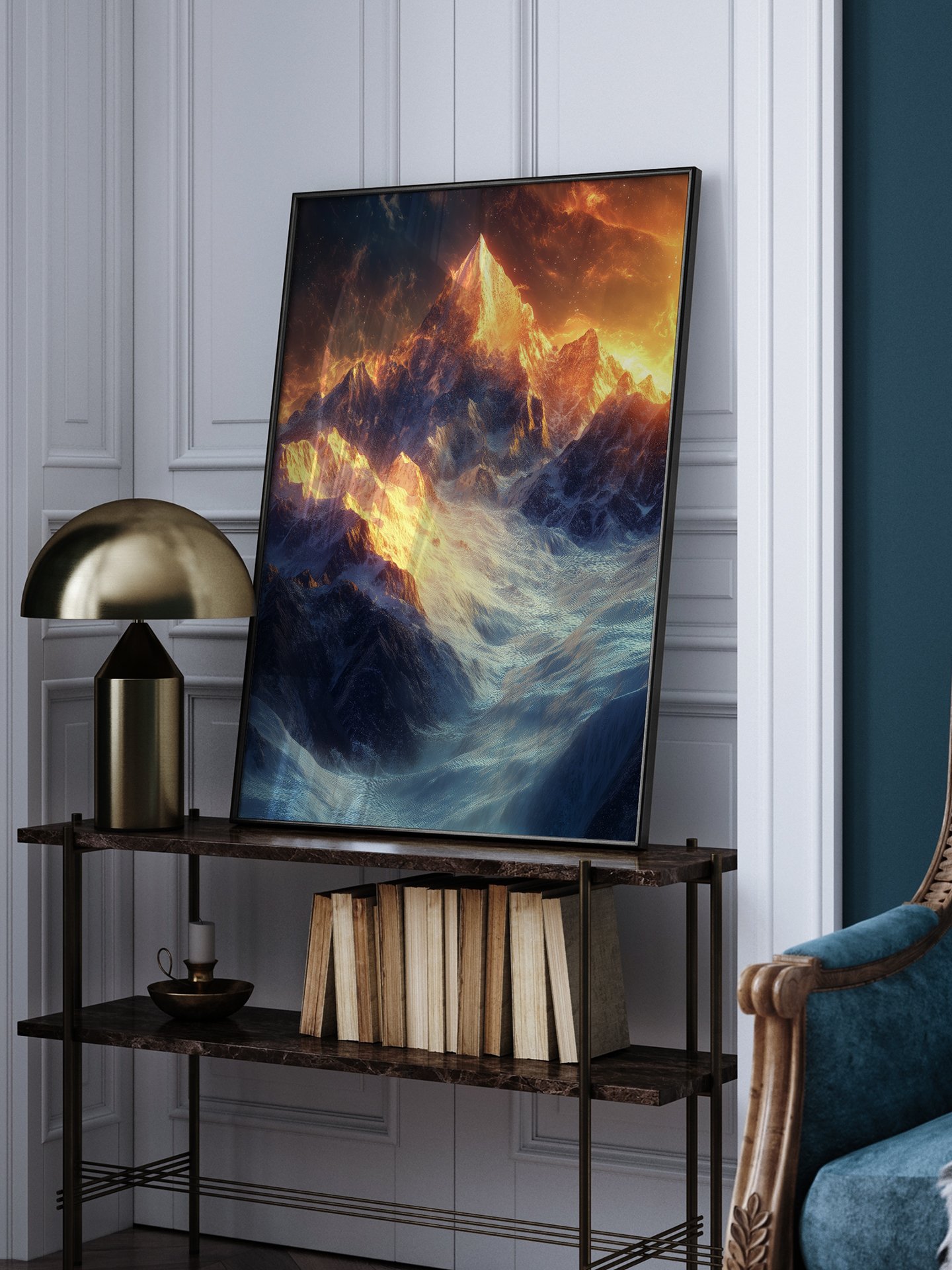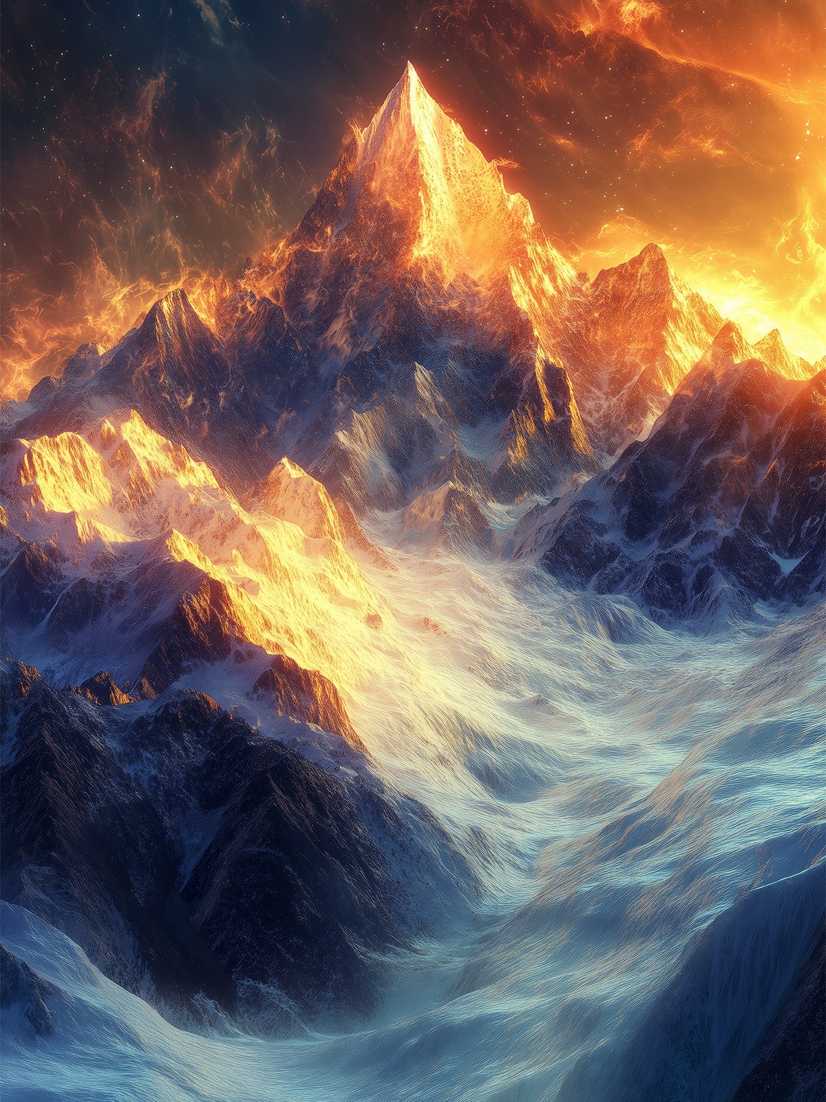 En la imagen, la imponente montaña nevada brilla con una luz gloriosa bajo el resplandor dorado. La nieve blanca y el resplandor espléndido se entretejen, y las nubes se elevan entre las montañas, mostrando el misterio y la grandeza de la cima de la tierra de nieve.