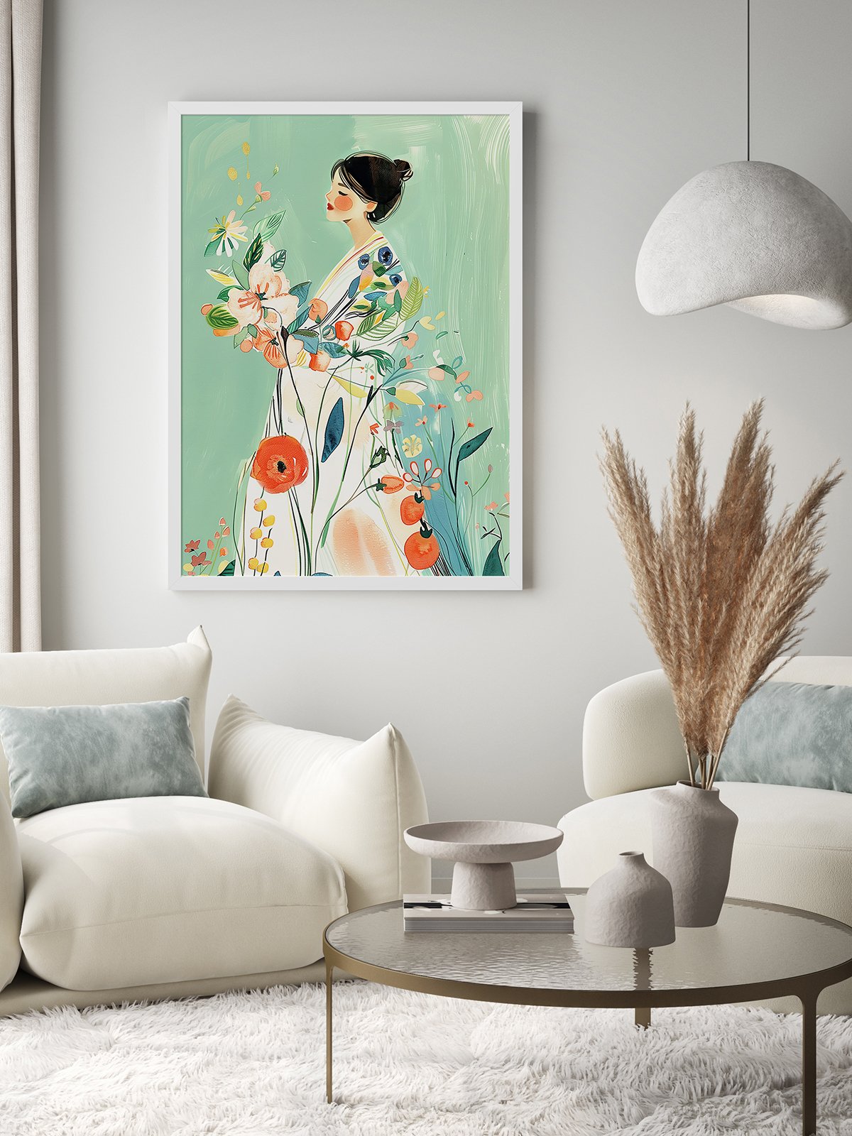 This image representa a mujer holding a bouquet of flowers, dressed in elegante attire, surrounded by colorful blossoms. The luz green fondo adds a fresh and refined touch to the escena, transmitiendo a sentido of tranquilidad and grace, as if she is in a serene jardín.