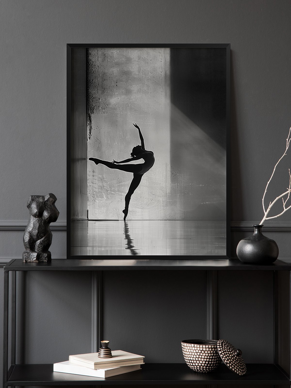 This black and white photograph captura the elegante momento of a dancer realizando amidst intersecting luz and sombra. The dancer’s silhouette is perfectly reflected on the floor, creando an encantador escena. The áspero textura of the fondo contrasts sharply with the dancer’s grace, filling the entire image with tranquilidad and poder, yendo a deep impression on the viewer.