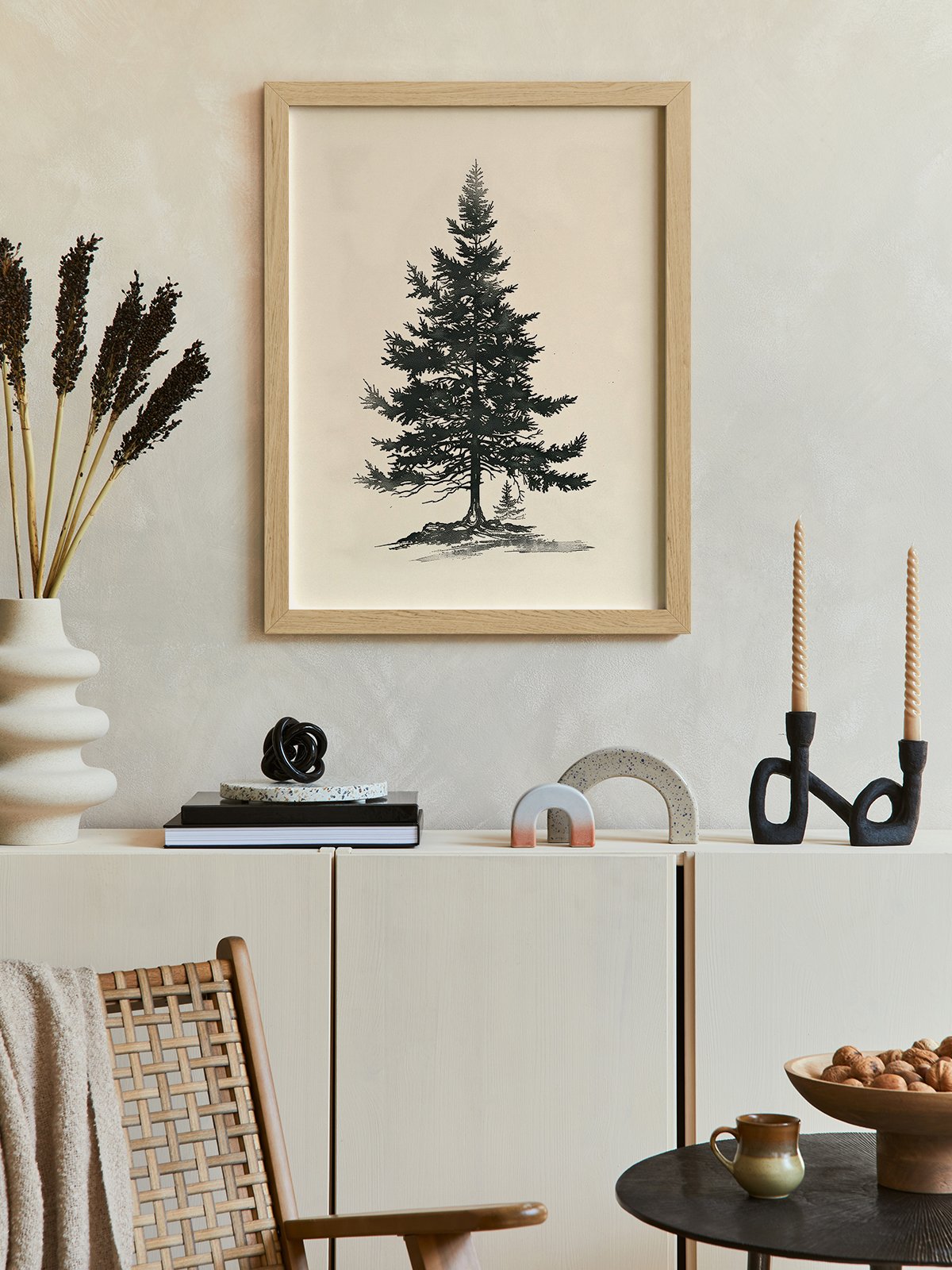 A pine tree stands in the centro of the pintura, with a straight trunk and exuberante branches, showing the único forma of a coniferous tree. The luz tones of the fondo contraste sharply with the pine trees, transmitiendo a simple and tranquil natural beauty as a whole.