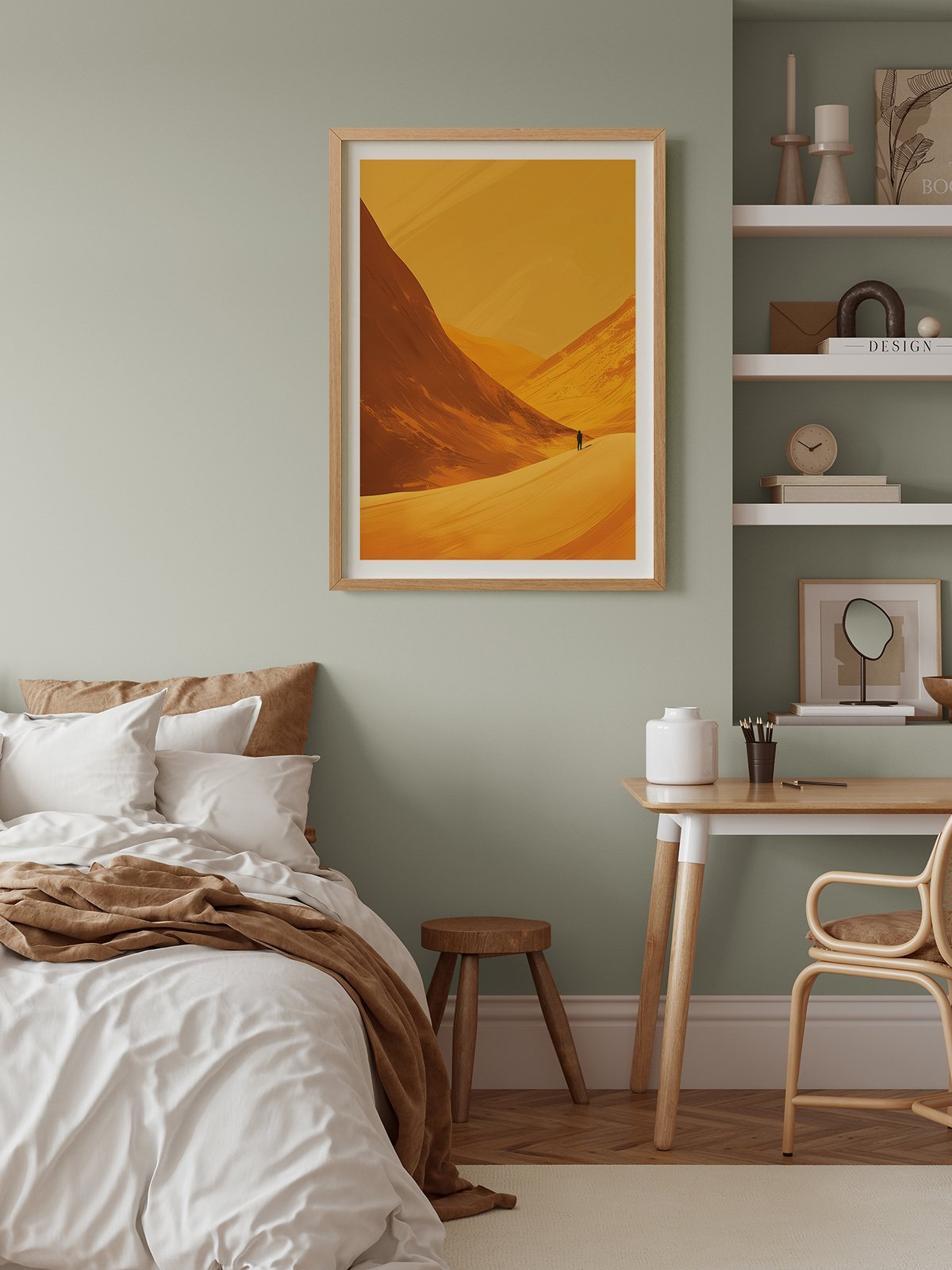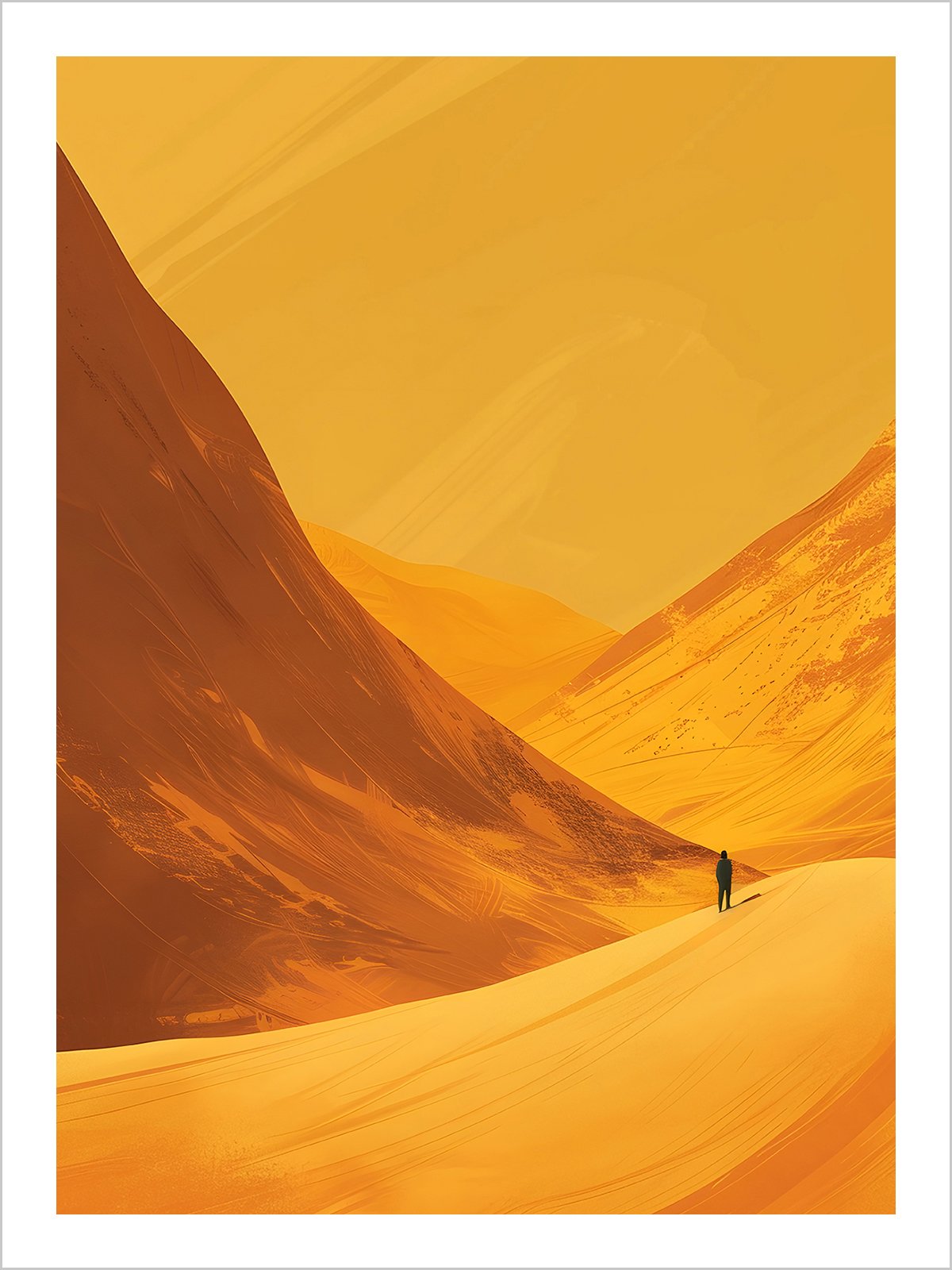 This pintura representa a persona caminando amidst vast sand dunes, usando suave tones and suave lines. The image conveys a sentido of solitude and exploration, as if the persona wandering through the desierto is contemplating the significado and direction of vida.