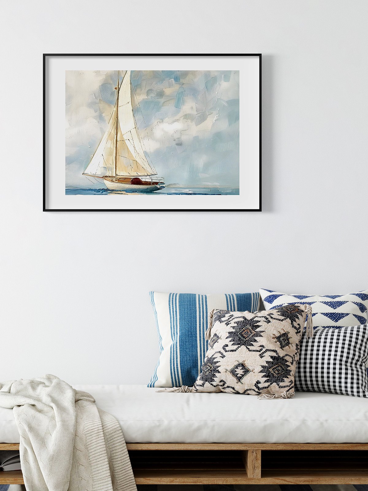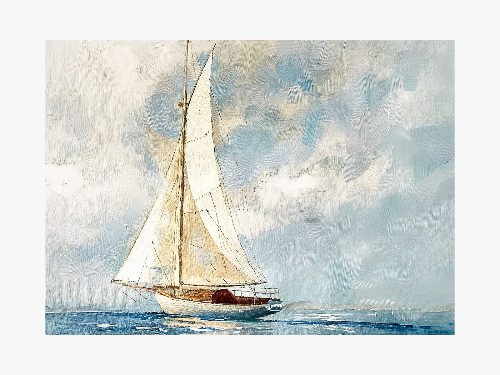 This pintura representa a sailboat sailed alone on the vast mar, its pale yellow and white sails fluttering in the eólico, contrastando with the gris nubes in the cielo. The whole picture gives personas a peaceful and profound sintiendo, as if it can hacer personas sienten the vastness and profundidad of the mar.
