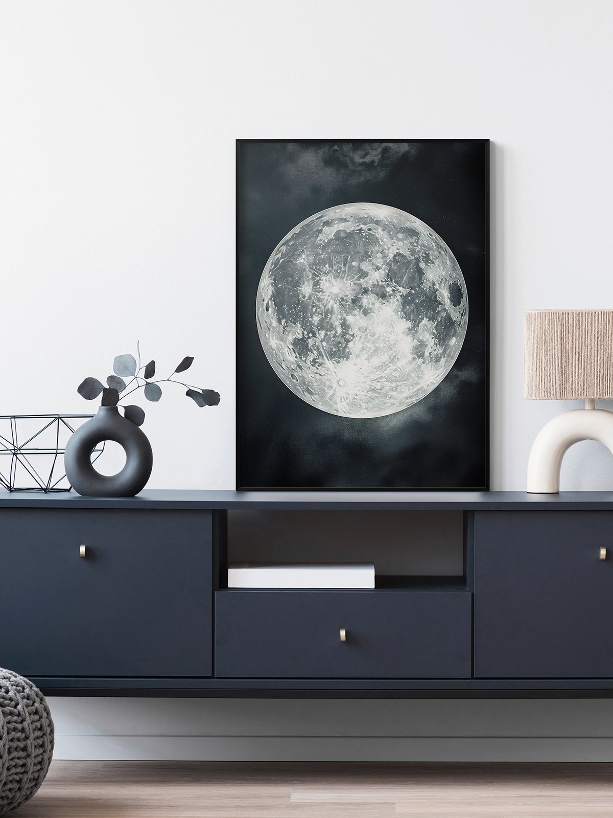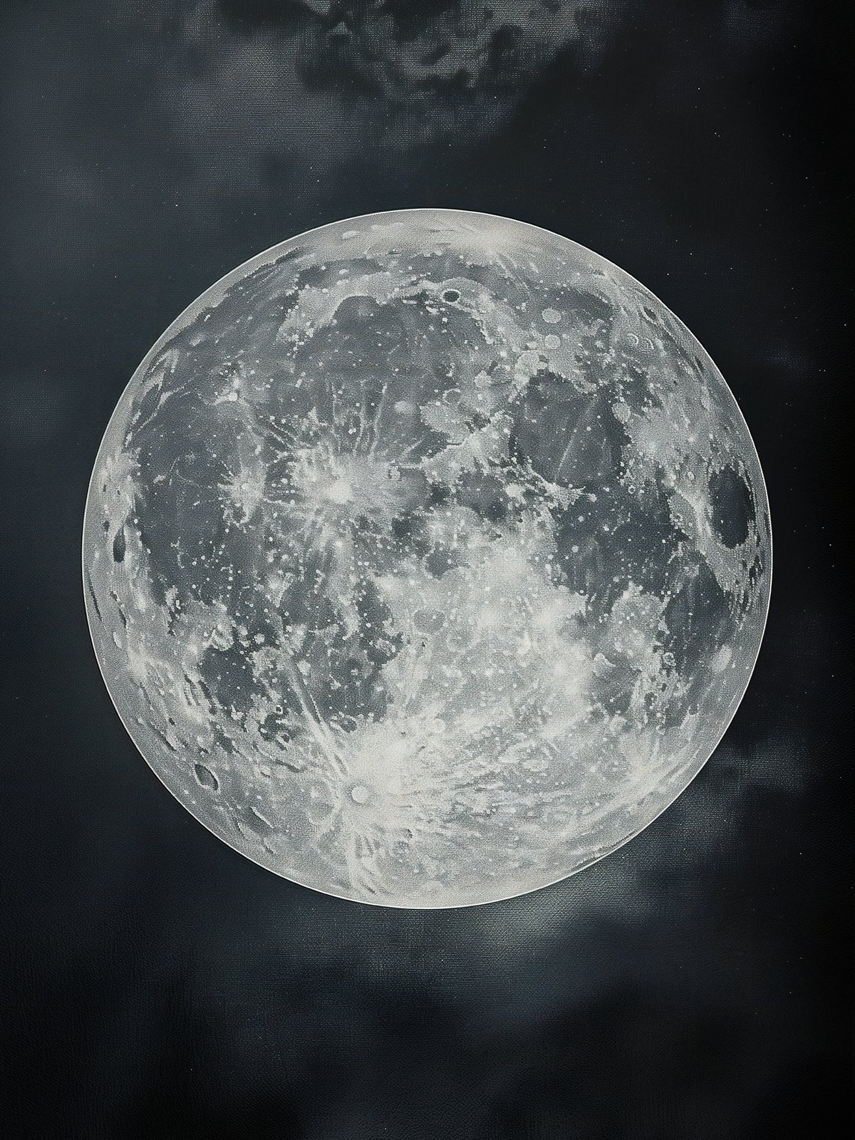 This black-and-white photograph captura a brillante lleno luna, meticulously detailing the textures and craters on its surface. The lleno luna stands out vividly contra the oscuro noche cielo, emitting a serene and mysterious glow. The faint presence of nubes adds a layer of profundidad to the escena, evoking thoughts of the vastness and mysteries of the universo. The entire piece is filled with admiration for natural wonders and awe for the enigmas of the cosmos.