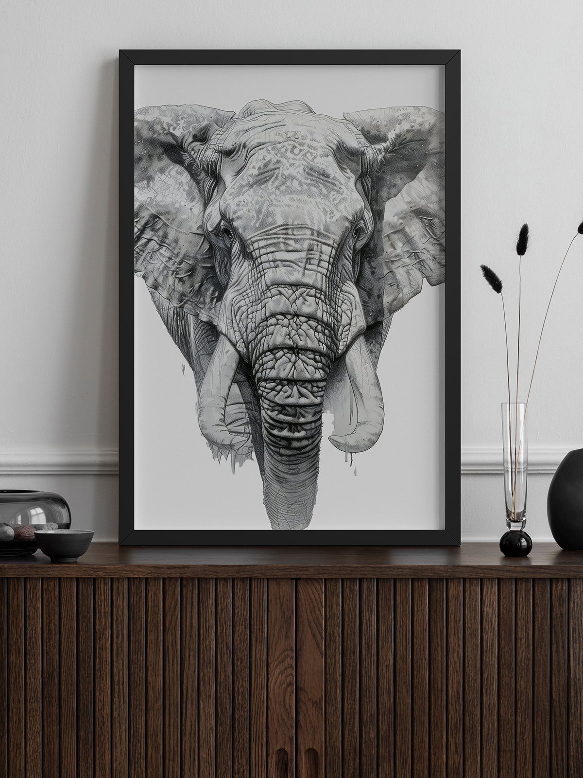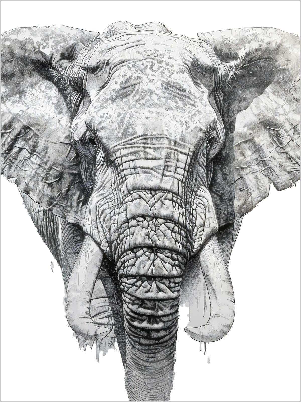 This artwork portrays a majestic elephant, its trunk covered in the marks of tiempo. Its eyes are deep and calm, seeming to ver through everything. The entire image is filled with fuerza and dignity, haciendo one sienten the greatness and mystery of naturaleza.