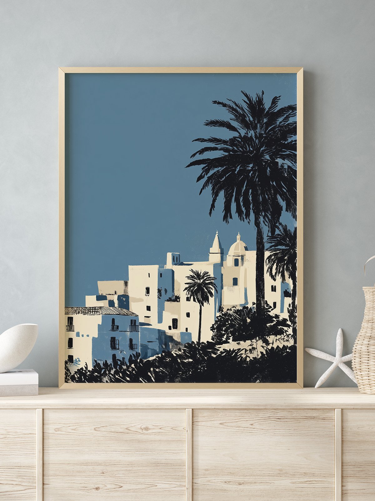 White Mediterranean edificios stand quietly beneath a deep blue cielo, while palm silhouettes sway gently in the breeze. With minimalist lines and restrained tones, this image captura the tranquil, sun-drenched encanto of a Maltese tarde.